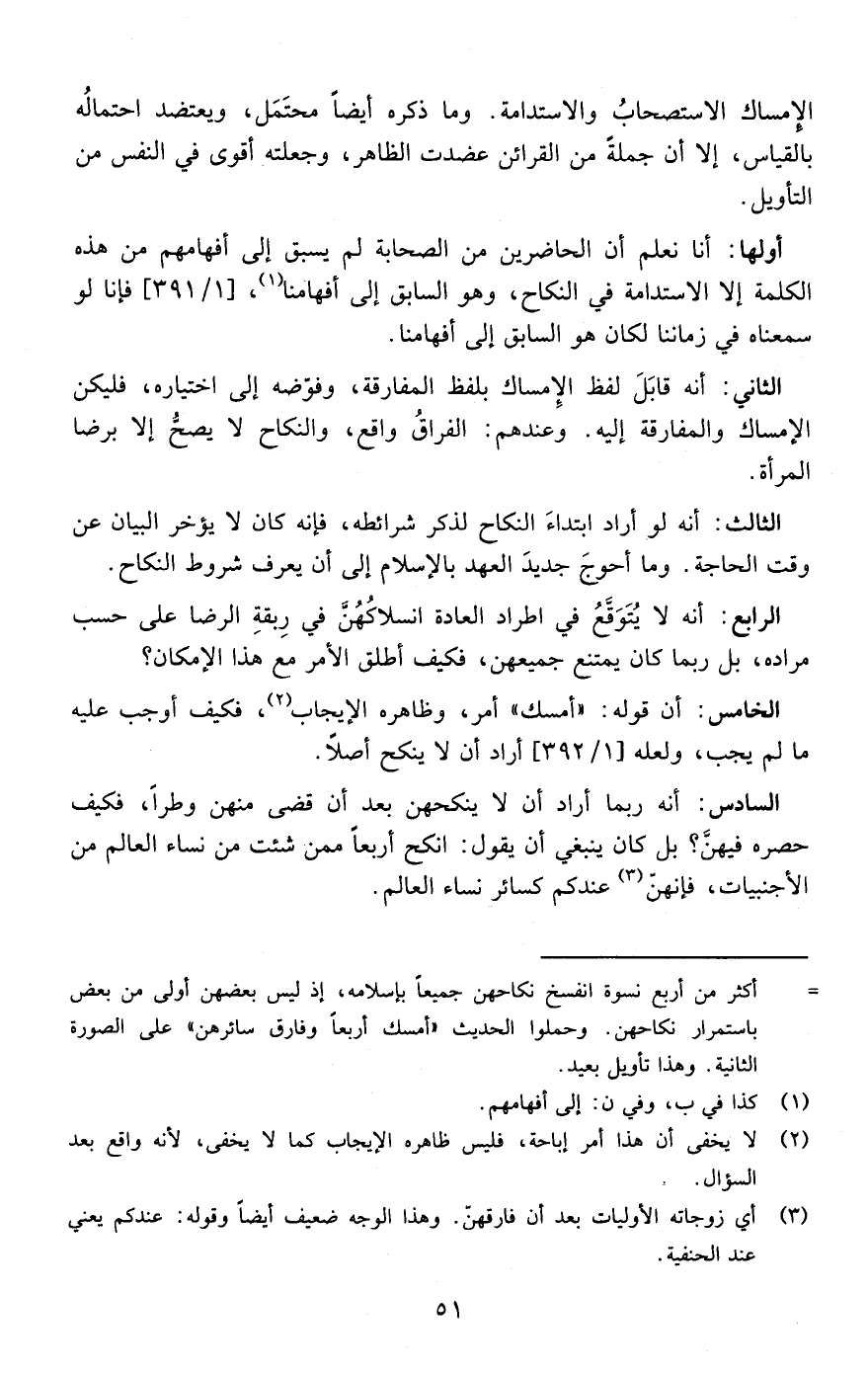 أولها: أنا نعلم أن الحاضرين من الصحابة لم يسبق إلى إفهامهم من هذه الكلمة إلا الاستدامة في النكاح وهو السابق إلى أفهامنا فإنا لو سمعناه في زماننا لكان هو السابق إلى أفهامنا