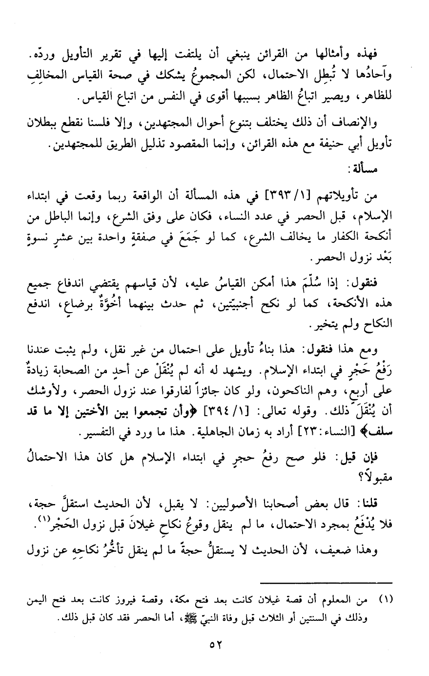 ومع هذا فنقول :هذا بناء تأويل على احتمال من غير نقل ولم يثبت عندنا رفع حجر في ابتداء الإسلام ويشهد له أنه لم ينقل عن أحد من الصحابة زيادة على أربعة وهم الناكحون ولو كان جائزا لفارقوا عند نزول الحصر ولأوشك أن ينقل ذلك وقوله تعالى {وَأَنْ تَجْمَعُوا بَيْنَ الأُخْتَيْنِ إِلاَّ مَا قَدْ سَلَفَ } ]النساء: من الآية23[أراد به زمان الجاهلية هذا ما ورد في التفسير