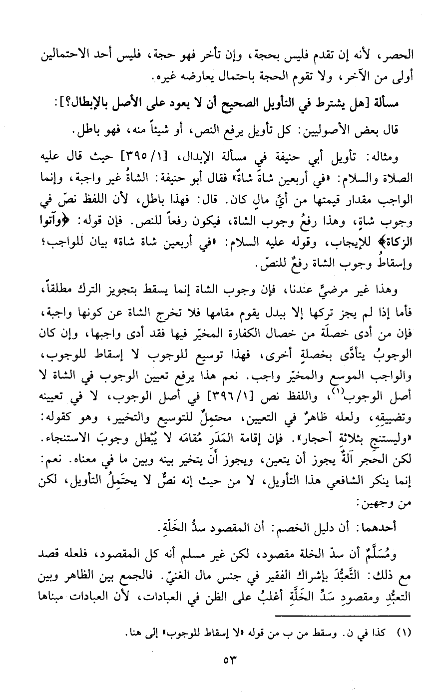 ومثاله تأويل أبي حنيفة في مسألة الأبدال حيث قال عليه الصلاة والسلام في أربعين شاة شاة فقال أبو حنيفة الشاة غير واجبة وإنما الواجب مقدار قيمتها من أي مال كان قال فهذا باطل لأن اللفظ نص في وجوب شاة وهذا رفع وجوب الشاة فيكون رفعا للنص فإن قوله { وَآتُوا الزَّكَاةَ } ]النساء: من الآية77[للإيجاب وقوله عليه السلام "في أربعين شاة شاة" بيان للواجب وإسقاط وجوب الشاة رفع للنص