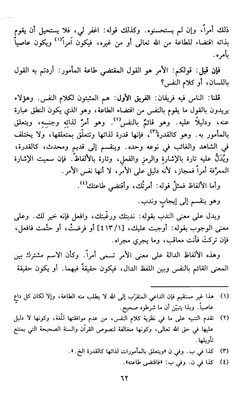 قلنا: الناس فيه فريقان: الفريق الأول :هم المثبتون لكلام النفس وهؤلاء يريدون بالقول ما يقوم بالنفس من اقتضاء الطاعة وهو الذي يكون النطق عبارة عنه ودليلا عليه وهو قائم بالنفس وهو أمر بذاته وجنسه ويتعلق بالمأمور به وهو كالقدرة فإنها قدرة لذاتها وتتعلق بمتعلقها ولا يختلف في الشاهد والغائب في نوعه وحده وينقسم إلى قديم ومحدث كالقدرة ويدل عليه تارة بالإشارة والرمز والفعل وتارة بالألفاظ فإن سميت الإشارة المعرفة أمرا فمجاز لأنه دليل على الأمر لا أنه نفس الأمر