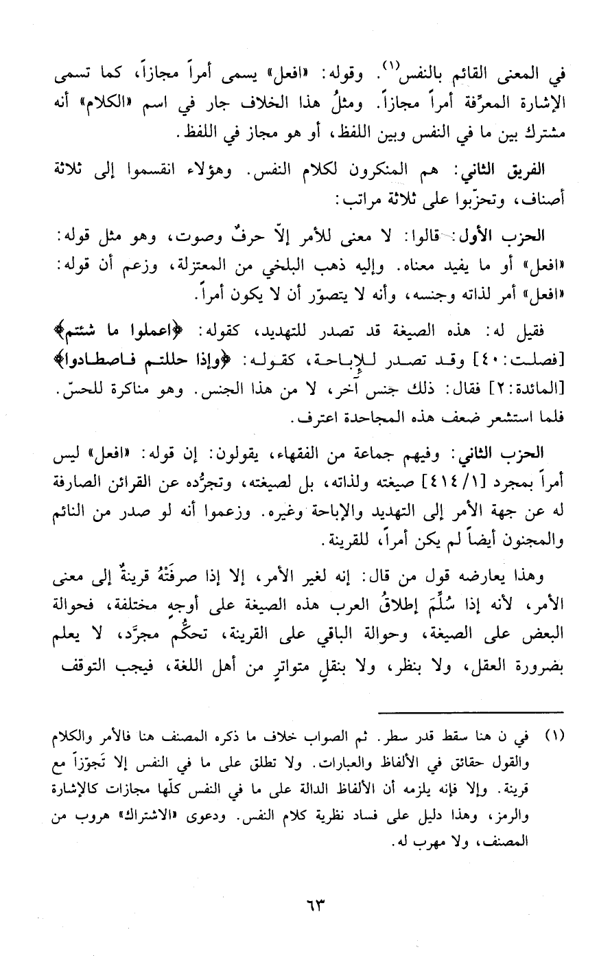 الفريق الثاني: هم المنكرون لكلام النفس وهؤلاء انقسموا إلى ثلاثة أصناف وتحزبوا على ثلاث مراتب: الحزب الأول: قالوا لا معنى للأمر إلا حرف وصوت وهو مثل قوله إفعل أو ما يفيد معناه وإليه ذهب البلخي من المعتزلة وزعم أن قوله إفعل أمر لذاته وجنسه وأنه لا يتصور أن لا يكون أمرا