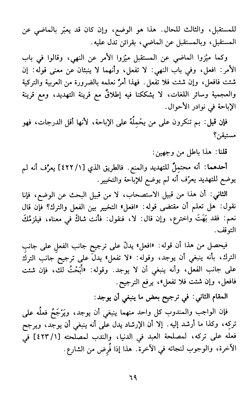 فيحصل من هذا أن قوله إفعل يدل على ترجيح جانب الفعل على جانب الترك بأنه ينبغي أن يوجد وقوله لا تفعل يدل على ترجيح جانب الترك على جانب الفعل وأنه ينبغي أن لا يوجد وقوله أبحت لك فإن شئت فافعل وإن شئت فلا تفعل يرفع الترجيح
