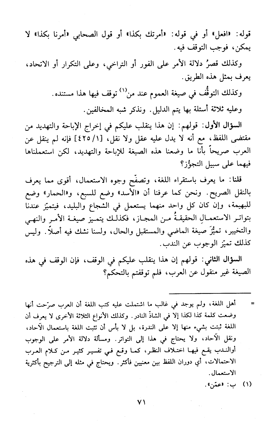 السؤال الأول : قولهم إن هذا ينقلب عليكم في إخراج الإباحة والتهديد من مقتضى اللفظ مع أنه لا يدل عليه عقل ولا نقل فإنه لم ينقل عن العرب صريحا بأنا ما وضعنا هذه الصيغة للإباحة والتهديد لكن استعملناها فيهما على سبيل التجوز؟