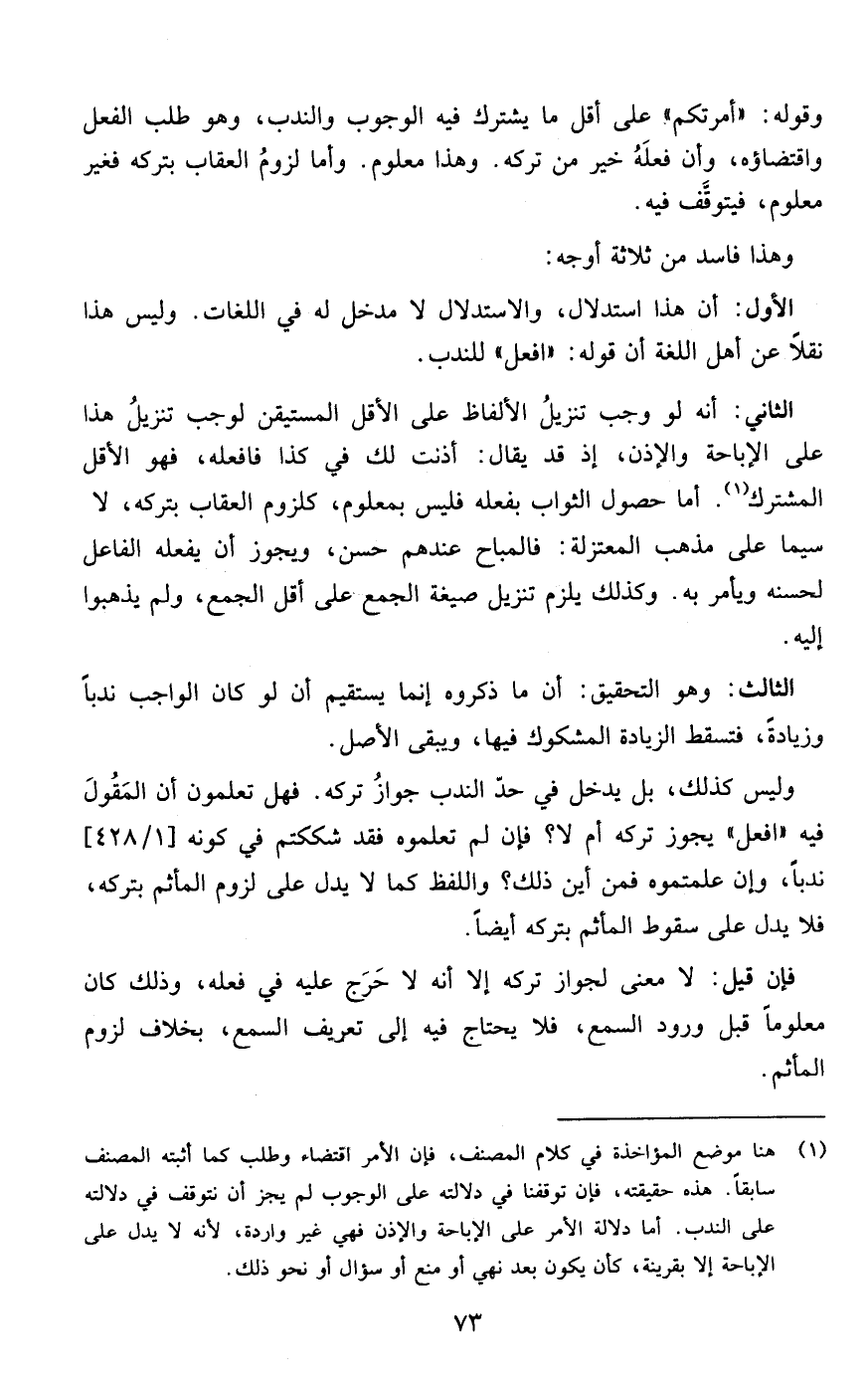 الثاني : أنه لو وجب تنزيل الألفاظ على الأقل المستيقن لوجب تنزيل هذا على الإباحة والإذن إذ قد يقال أذنت لك في كذا فافعله فهو الأقل المشترك أما حصول الثواب بفعله فليس بمعلوم كلزوم العقاب بتركه لا سيما على مذهب المعتزلة فالمباح عندهم حسن ويجوز أن يفعله الفاعل لحسنه ويأمر به وكذلك يلزم تنزيل صيغة الجمع على أقل الجمع ولم يذهبوا إليه