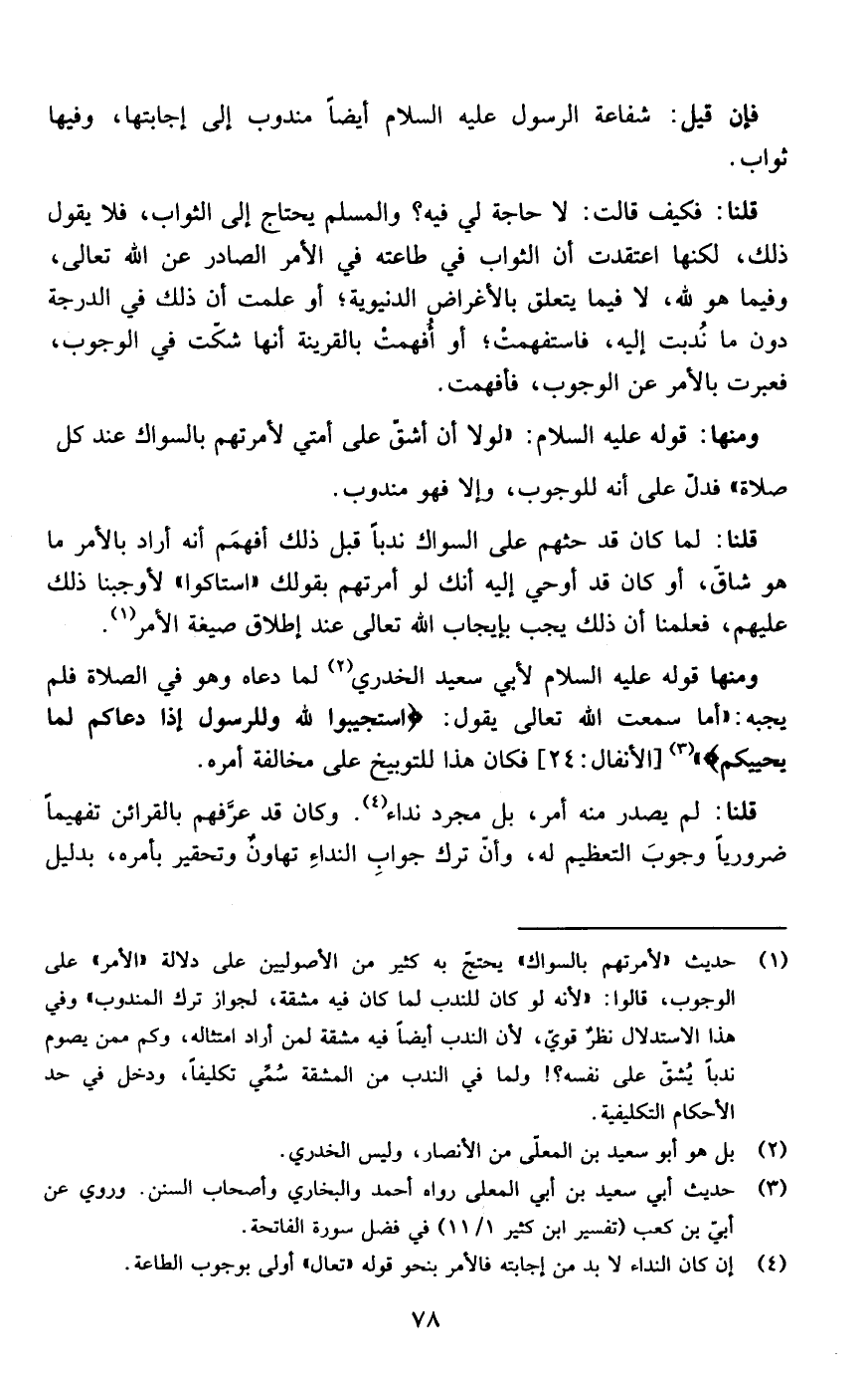 ومنها قوله عليه السلام لأبي سعيد الخدري لما دعاه وهو في الصلاة فلم يجبه أما سمعت الله تعالى يقول {اسْتَجِيبُوا لِلَّهِ وَلِلرَّسُولِ إِذَا دَعَاكُمْ لِمَا يُحْيِيكُمْ} ]لأنفال: من الآية24[فكان هذا التوبيخ على مخالفة أمره