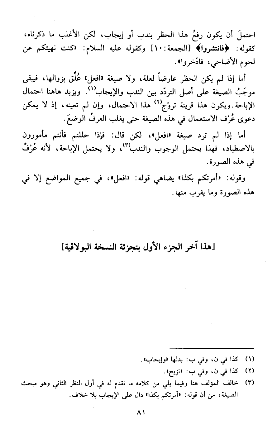 احتمل أن يكون رفع هذا الحظر بندب وإباحة لكن الأغلب ما ذكرناه كقوله {فَانْتَشِرُوا} ]الجمعة: من الآية10[وكقوله عليه السلام: "كنت نهيتكم عن لحوم الأضاحي فادخروا "
