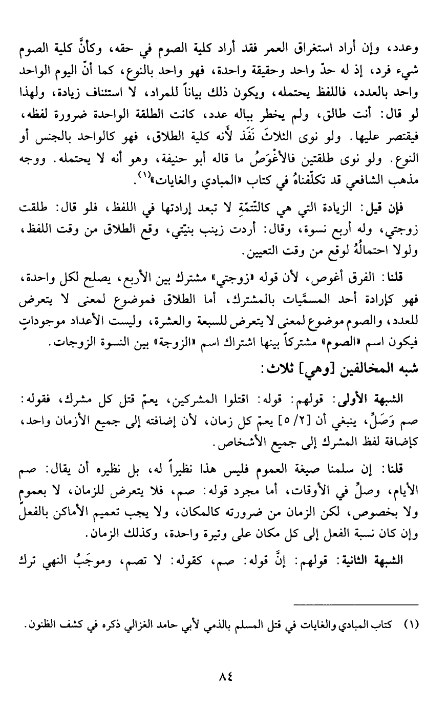 وعدد وإن أراد إستغراق العمر فقد أراد كلية الصوم في حقه وكأن كلية الصوم شيء فرد أذله حد واحد وحقيقة واحدة فهو واحد بالنوع كما أن اليوم الواحد واحد بالعدد واللفظ يحتمله ويكون ذلك بيانا للمراد لا استئناف زيادة ولهذا لو قال أنت طالق ولم يخطر بباله عدد كانت الطلقة الواحدة ضرورة لفظه فيقتصر عليها ولو نوى الثلاثة بعد لأنه كلية الطلاق فهو كالواحد بالجنس أو النوع ولو نوى طلقتين فالأغوص ما قاله أبو حنيفة وهو أنه لا يحتمله ووجه مذهب الشافعي قد تكلفناه في كتاب المبادىء والغايات