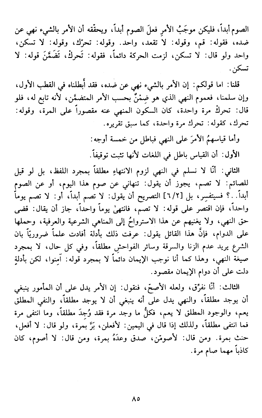 قلنا:أما قولكم أن الأمر بالشيء نهي عن ضده فقد أبطلناه في القطب الأول وإن سلمنا فعموم النهي الذي هو ضمن بحسب الأمر المتضمن لأنه تابع له فلو قال تحرك مرة واحدة كان السكون المنهي عنه مقصورا على المرة وقوله تحرك كقوله تحرك مرة واحدة كما سبق تقريره وأما قياسهم الأمر على النهي فباطل من خمسة أوجه الأول: أن القياس باطل في اللغات لأنها تثبت توقيفا