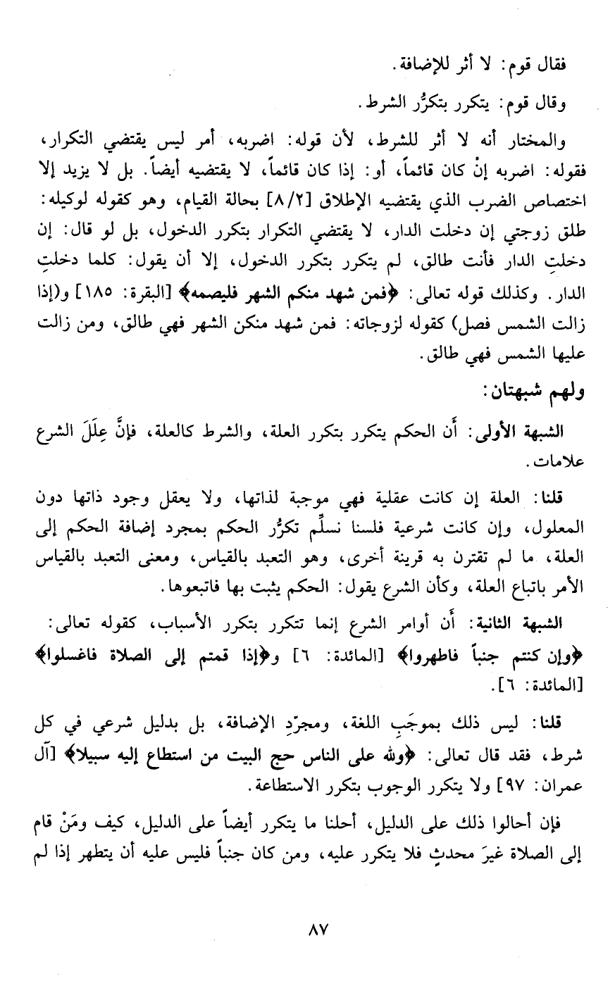 قلنا:ليس ذلك بموجب اللغة ومجرد الإضافة بل بدليل شرعي في كل شرط فقد قال تعالى {وَلِلَّهِ عَلَى النَّاسِ حِجُّ الْبَيْتِ مَنِ اسْتَطَاعَ إِلَيْهِ سَبِيلاً } ]آل عمران: من الآية97[ولا يتكرر الوجوب بتكرر الاستطاعة