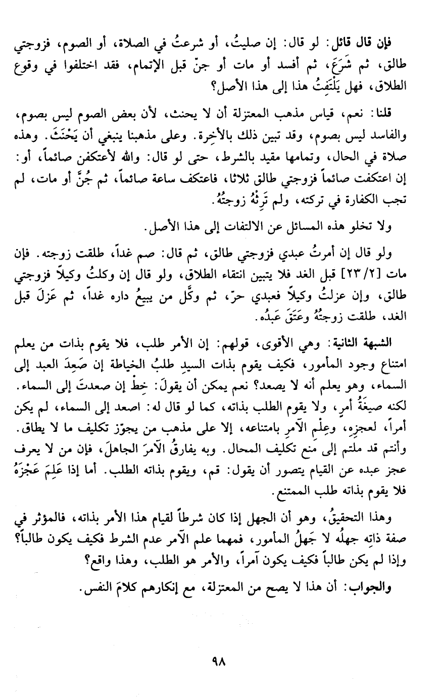 الشبهة الثانية : وهي الأقوى قولهم إن الأمر طلب فلا يقوم بذات من يعلم امتناع وجود المأمور فكيف يقوم بذات السيد طلب الخياطة إن صعد العبد إلى السماء وهو يعلم أنه لا يصعد نعم يمكن أن يقول خط إن صعدت إلى السماء لكنه صيغة أمر ولا يقوم الطلب بذاته كما لو قال له اصعد إلى السماء لم يكن أمرا لعجزه وعلم الآمر بامتناعه إلا على مذهب من يجوز تكليف ما لا يطاق وأنتم قد ملتم إلى منع تكليف المحال وبه يفارق الآمر الجاهل فإن من لا يعرف عجز عبده عن القيام يتصور أن يقول قم ويقوم بذاته الطلب أما إذا علم عجزه فلا يقوم بذاته طلب الممتنع