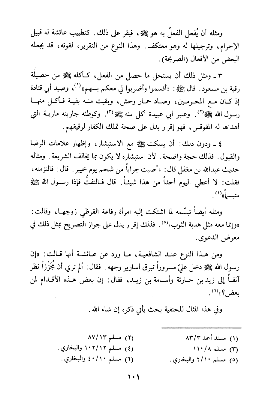 ٤ - ودون ذلك: أن يسكت - صلى الله عليه وسلم - مع الاستبشار، وإظهار علامات الرضا والقبول. فذلك حجة واضحة. لأن استبشاره لا يكون بما يخالف الشريعة. ومثاله حديث عبد الله بن مغفل قال: "أصبت جراباً من شحم يوم خيبر. قال: فالتزمته، فقلت: لا أعطي اليوم أحداً من هذا شيئاً. قال فالتفتُّ فإذا رسول الله - صلى الله عليه وسلم - متبسماً" (٤).