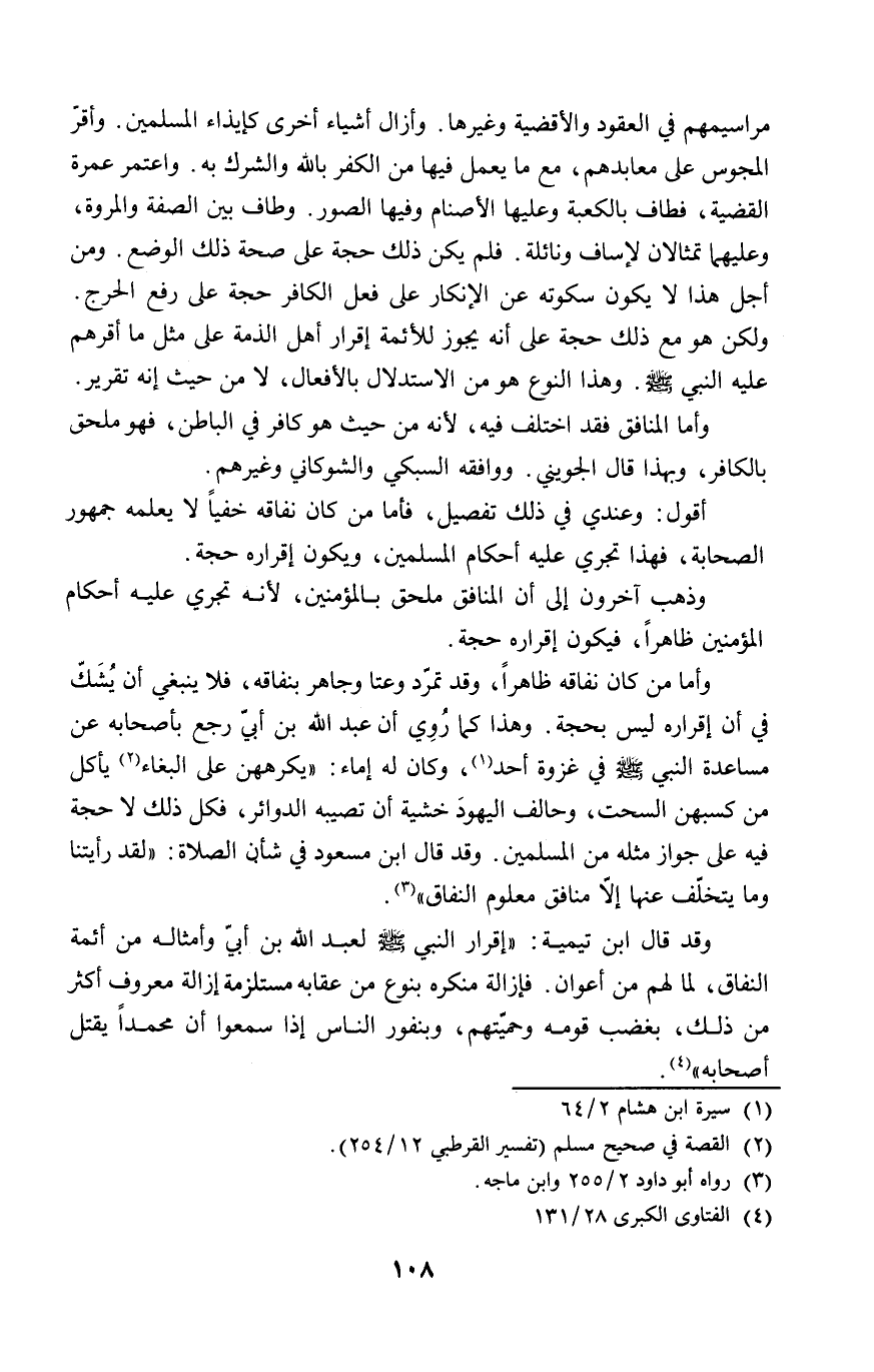 وأما من كان نفاقه ظاهراً، وقد تمرّد وعتا وجاهر بنفاقه، فلا ينبغي أن يُشَكّ في أن إقراره ليس بحجة. وهذا كما رُوِي أن عبد الله بن أبيّ رجع بأصحابه عن مساعدة النبي - صلى الله عليه وسلم - في غزوة أحد (١)، وكان له إماء: "يكرههن على البغاء (٢) يأكل من كسبهن السحت، وحالف اليهودَ خشية أن تصيبه الدوائر، فكل ذلك لا حجة فيه على جواز مثله من المسلمين. وقد قال ابن مسعود في شأن الصلاة: "لقد رأيتنا وما يتخلّف عنها إلا منافق معلوم النفاق" (٣).