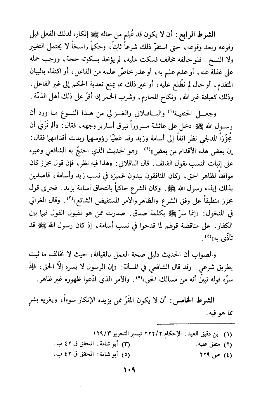 والصواب أن الحديث دليل صحة العمل بالقيافة، حيث لا تخالف ما ثبت بطريق شرعي. وقد قال الشافعي في المسألة: "إن الرسول لا يسره إلا الحق، فإذْ سرّه قوله تبيّن أنه من مسالك الحق" (٥). والأمر الذي ادّعوا ظهوره غير ظاهر.