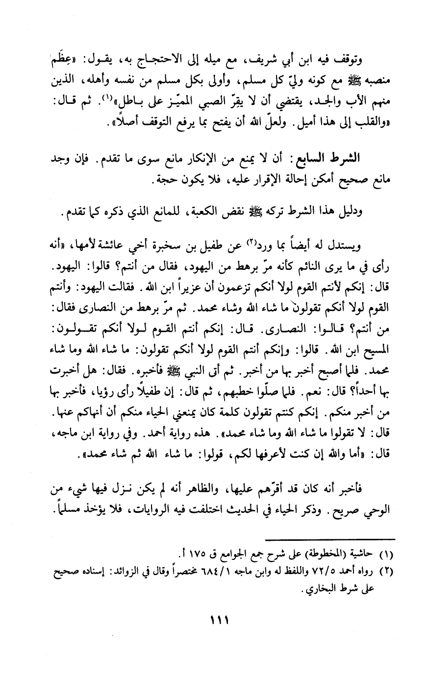 وتوقف فيه ابن أبي شريف، مع ميله إلى الاحتجاج به، يقول: "عِظَم منصبه - صلى الله عليه وسلم - مع كونه وليّ كل مسلم، وأولى بكل مسلم من نفسه وأهله، الذين منهم الأب والجد، يقتضي أن لا يقِرّ الصبي المميّز على باطلٍ" (١). ثم قال: "والقلب إلى هذا أميل. ولعلّ الله أن يفتح بما يرفع التوقف أصلاً".