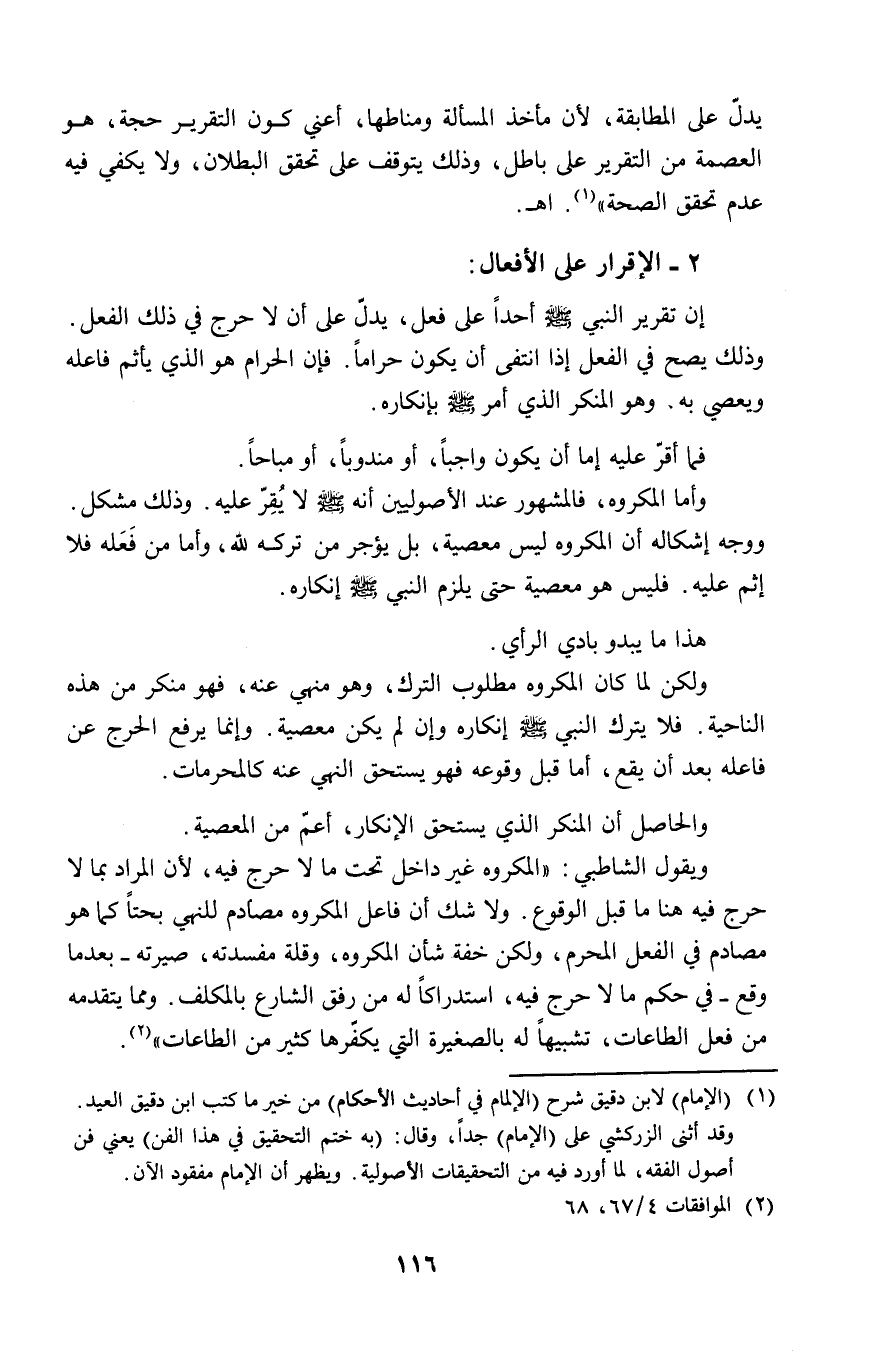 وأما المكروه، فالمشهور عند الأصوليين أنه - صلى الله عليه وسلم - لا يُقِر عليه. وذلك مشكل. ووجه إشكاله أن المكروه ليس معصية، بل يؤجر من تركه لله، وأما من فَعَله فلا إثم عليه. فليس هو معصية حتى يلزم النبي - صلى الله عليه وسلم - إنكاره.