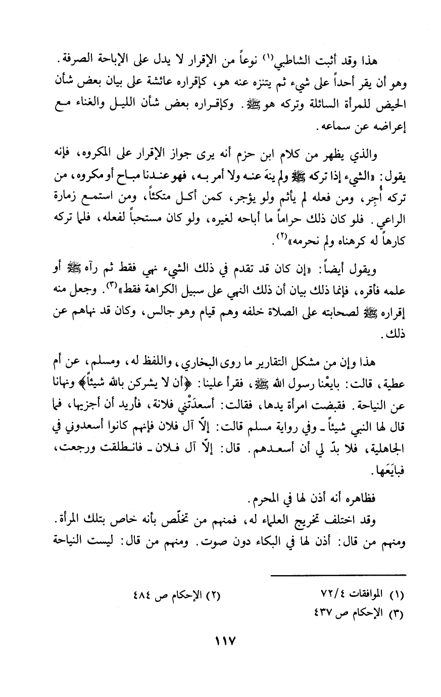 هذا وقد أثبت الشاطبي (١) نوعاً من الإقرار لا يدل على الإباحة الصرفة. وهو أن يقر أحداً على شيء ثم يتنزه عنه هو، كإقراره عائشة على بيان بعض شأن الحيض للمرأة السائلة وتركه هو - صلى الله عليه وسلم -. وكإقراره بعض شأن الليل والغناء مع إعراضه عن سماعه.