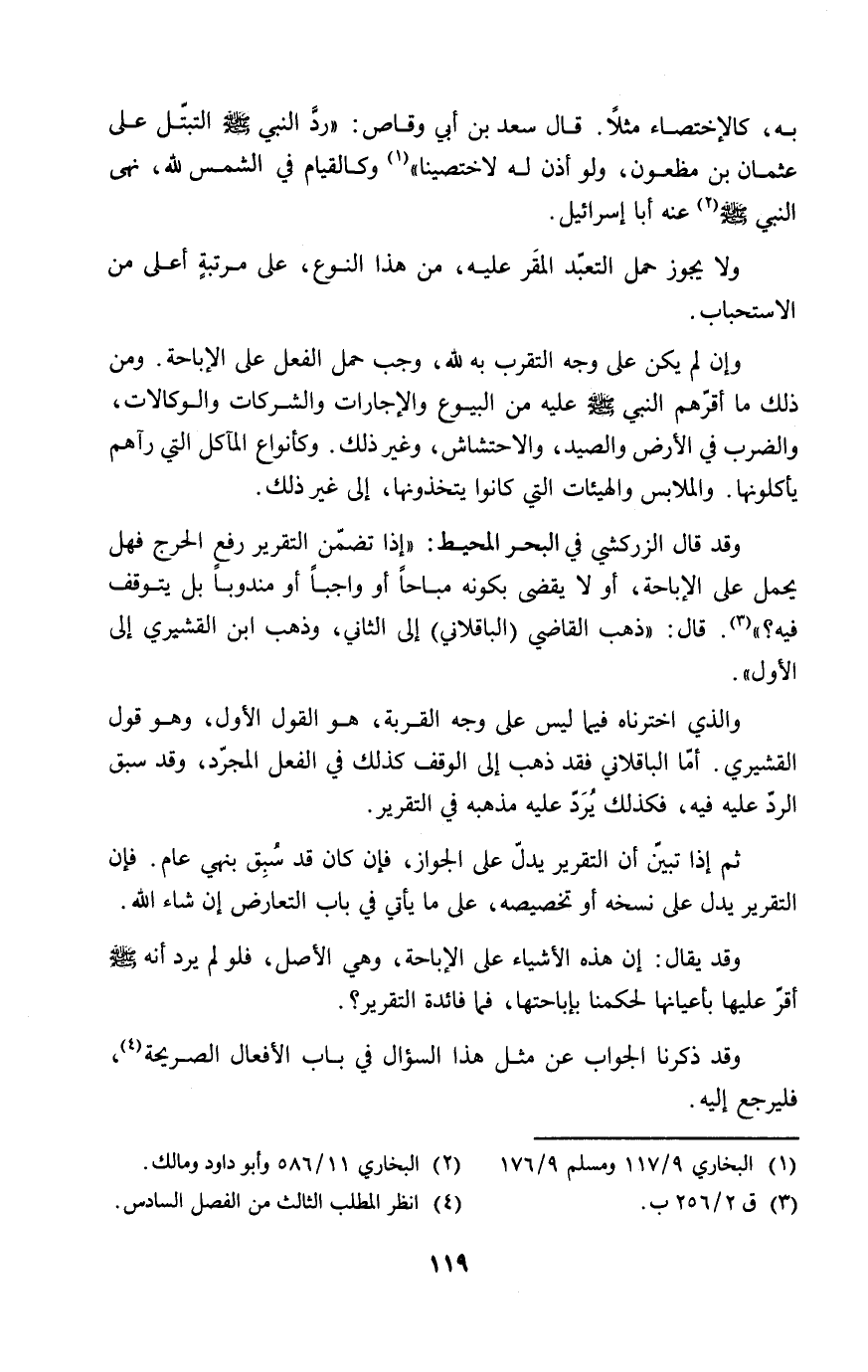وإن لم يكن على وجه التقرب به لله، وجب حمل الفعل على الإباحة. ومن ذلك ما أقرّهم النبي - صلى الله عليه وسلم - عليه من البيوع والإجارات والشركات والوكالات، والضرب في الأرض والصيد، والاحتشاش، وغير ذلك. وكأنواع المآكل التي رآهم يأكلونها. والملابس والهيئات التي كانوا يتخذونها، إلى غير ذلك.