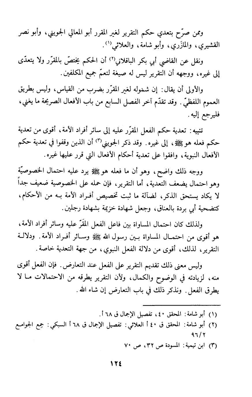 تنبيه: تعدية حكم الفعل المقرّر عليه إلى سائر أفراد الأمة، أقوى من تعدية حكم فعله هو - صلى الله عليه وسلم -، إلى غيره. وقد ذكر الجويني (٣) أن الذين وقفوا في تعدية حكم الأفعال النبوية، وافقوا على تعدية أحكام الأفعال التي قرر عليها غيره.