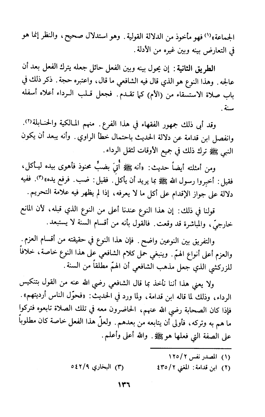 الطريق الثانية: إن يحول بينه وبين الفعل حائل جعله يترك الفعل بعد أن عالجه. وهذا النوع هو الذي قال فيه الشافعي ما قال، واعتبره حجة. ذكر ذلك في باب صلاة الاستسقاء من (الأم) كما تقدم. فجعل قلب الرداء أعلاه أسفله سنة.