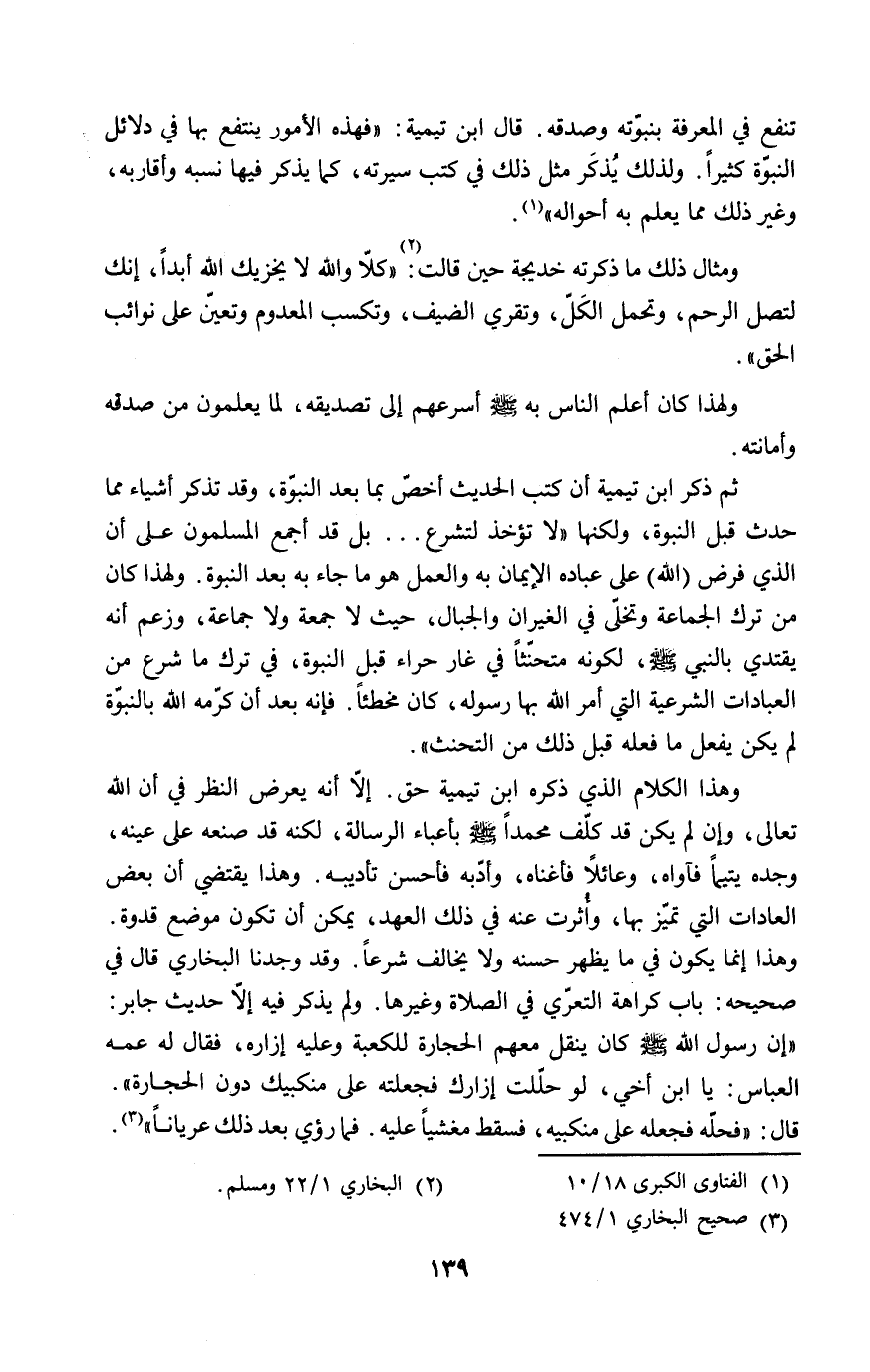 وهذا الكلام الذي ذكره ابن تيمية حق. إلاّ أنه يعرض النظر في أن الله تعالى، وإن لم يكن قد كلّف محمداً - صلى الله عليه وسلم - بأعباء الرسالة، لكنه قد صنعه على عينه، وجده يتيماً فآواه، وعائلاً فأغناه، وأدّبه فأحسن تأديبه. وهذا يقتضي أن بعض العادات التي تميّز بها، وأُثرت عنه في ذلك العهد، يمكن أن تكون موضع قدوة. وهذا إنما يكون في ما يظهر حسنه ولا يخالف شرعاً. وقد وجدنا البخاري قال في صحيحه: باب كراهة التعرّي في الصلاة وغيرها. ولم يذكر فيه إلا حديث جابر: "إن رسول الله - صلى الله عليه وسلم - كان ينقل معهم الحجارة للكعبة وعليه إزاره، فقال له عمه العباس: يا ابن أخي، لو حلّلت إزارك فجعلته على منكبيك دون الحجارة". قال: "فحلّه فجعله على منكبيه، فسقط مغشياً عليه. فما رؤي بعد ذلك عرياناً" (٣).