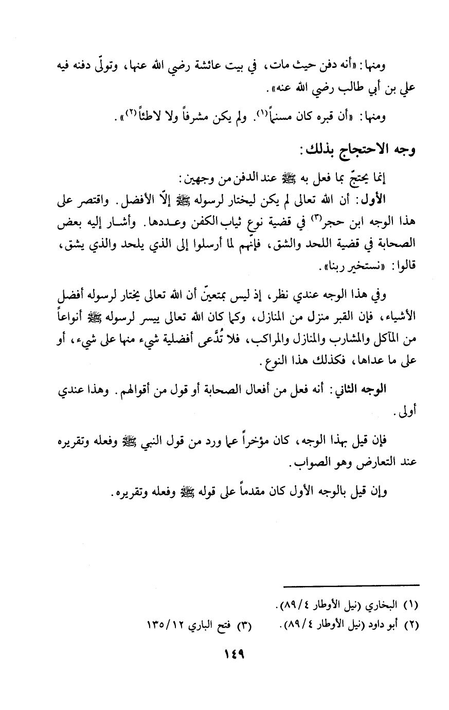الأول: أن الله تعالى لم يكن ليختار لرسوله - صلى الله عليه وسلم - إلا الأفضل. واقتصر على هذا الوجه ابن حجر (٣) في قضية نوع ثياب الكفن وعددها. وأشار إليه بعض الصحابة في قضية اللحد والشق، فإنهم لما أرسلوا إلى الذي يلحد والذي يشق، قالوا: "نستخير ربنا".