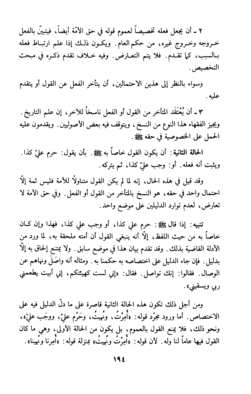 ومن أجل ذلك تكون هذه الحالة الثانية قاصرة على ما دلّ الدليل فيه على الاختصاص. أما ورود مجرّد قوله: "أُمِرْتُ، ونُهيتُ، وحَرُم عليّ، ووجَب عليّ"، ونحو ذلك، فلا يمنع القول بالعموم، بل يكون من الحالة الأولى، وهي ما كان القول فيها عاماً لنا وله. لأن قوله: "أُمِرْتُ ونُهيتُ" بمنزلة قوله: "أُمِرنا ونُهينا".