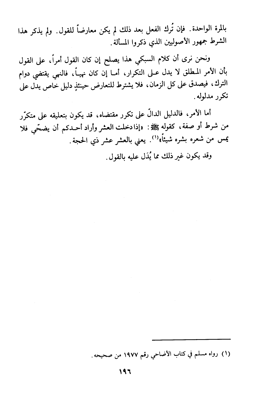 أما الأمر، فالدليل الدالّ على تكرر مقتضاه، قد يكون بتعليقه على متكرّر من شرط أو صفة، كقوله - صلى الله عليه وسلم -: "إذا دخلت العشر وأراد أحدكم أن يضحّي فلا يمس من شعره بشره شيئاً" (١). يعني بالعشر عشر ذي الحجة.