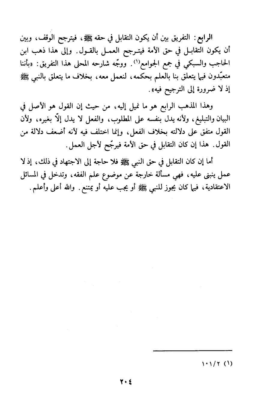 الرابع: التفريق بين أن يكون التقابل في حقه - صلى الله عليه وسلم -، فيترجح الوقف، وبين أن يكون التقابل في حق الأمة فيترجح العمل بالقول. وإلى هذا ذهب ابن الحاجب والسبكي في جمع الجوامع (١). ووجّه شارحه المحلى هذا التفريق: "بأننا متعبّدون فيما يتعلق بنا بالعلم بحكمه، لنعمل معه، بخلاف ما يتعلق بالنبي - صلى الله عليه وسلم - إذ لا ضرورة إلى الترجيح فيه".