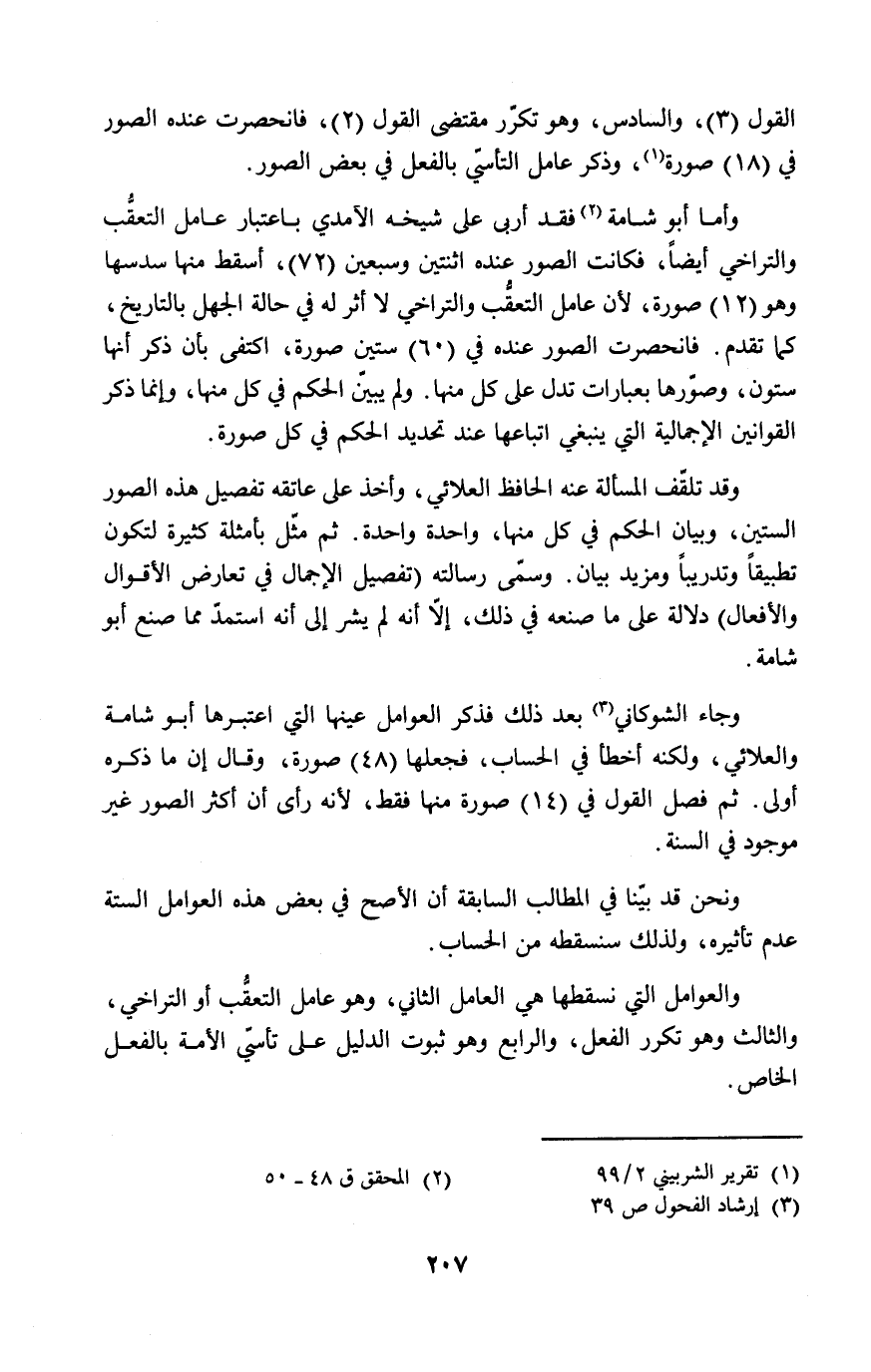 وجاء الشوكاني (٣) بعد ذلك فذكر العوامل عينها التي اعتبرها أبو شامة والعلائي، ولكنه أخطأ في الحساب، فجعلها (٤٨) صورة، وقال ان ما ذكره أولى. ثم فصل القول في (١٤) صورة منها فقط، لأنه رأى أن أكثر الصور غير موجود في السنة.