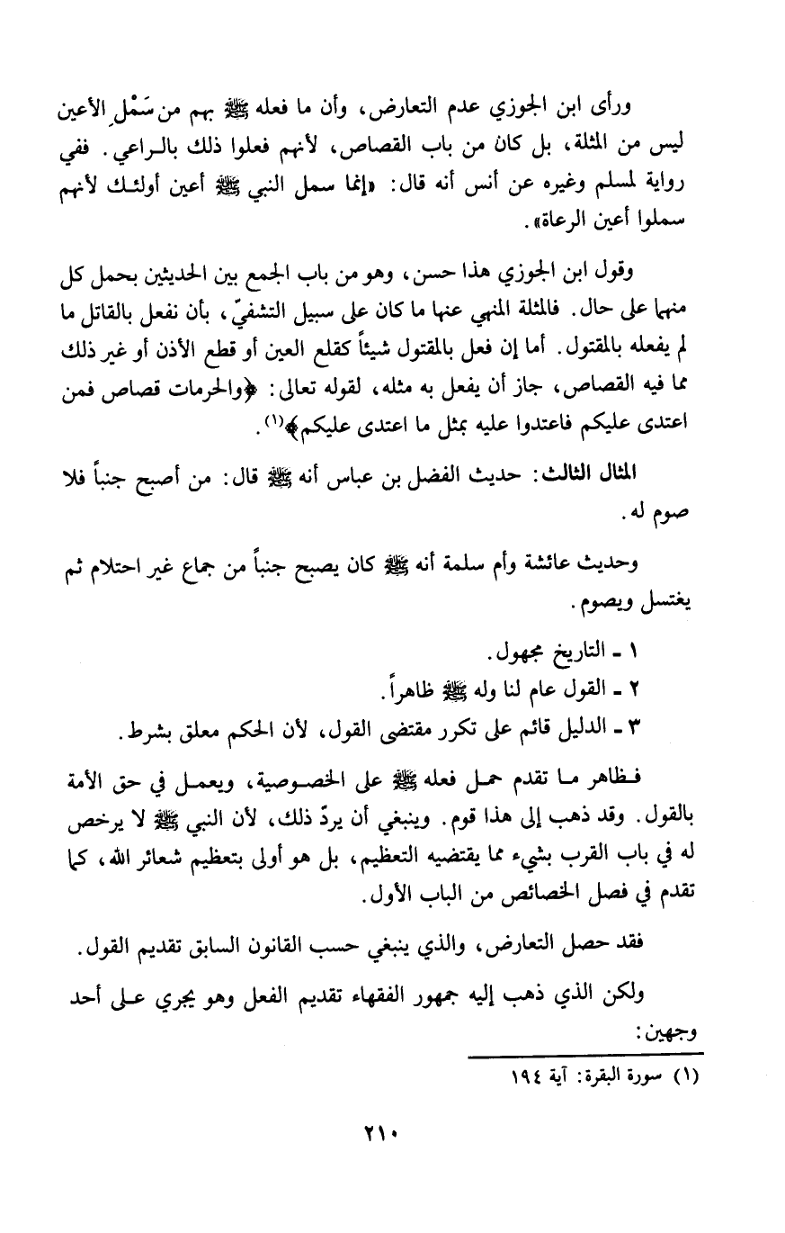 وقول ابن الجوزي هذا حسن، وهو من باب الجمع بين الحديثين بحمل كل منهما على حال. فالمثلة المنهي عنها ما كان على سبيل التشفّي، بأن نفعل بالقاتل ما لم يفعله بالمقتول. أما إن فعل بالمقتول شيئاً كقلع العين أو قطع الأذن أو غير ذلك مما فيه القصاص، جاز أن يفعل به مثله، لقوله تعالى: {والحرمات قصاص فمن اعتدى عليكم فاعتدوا عليه بمثل ما اعتدى عليكم} (١).