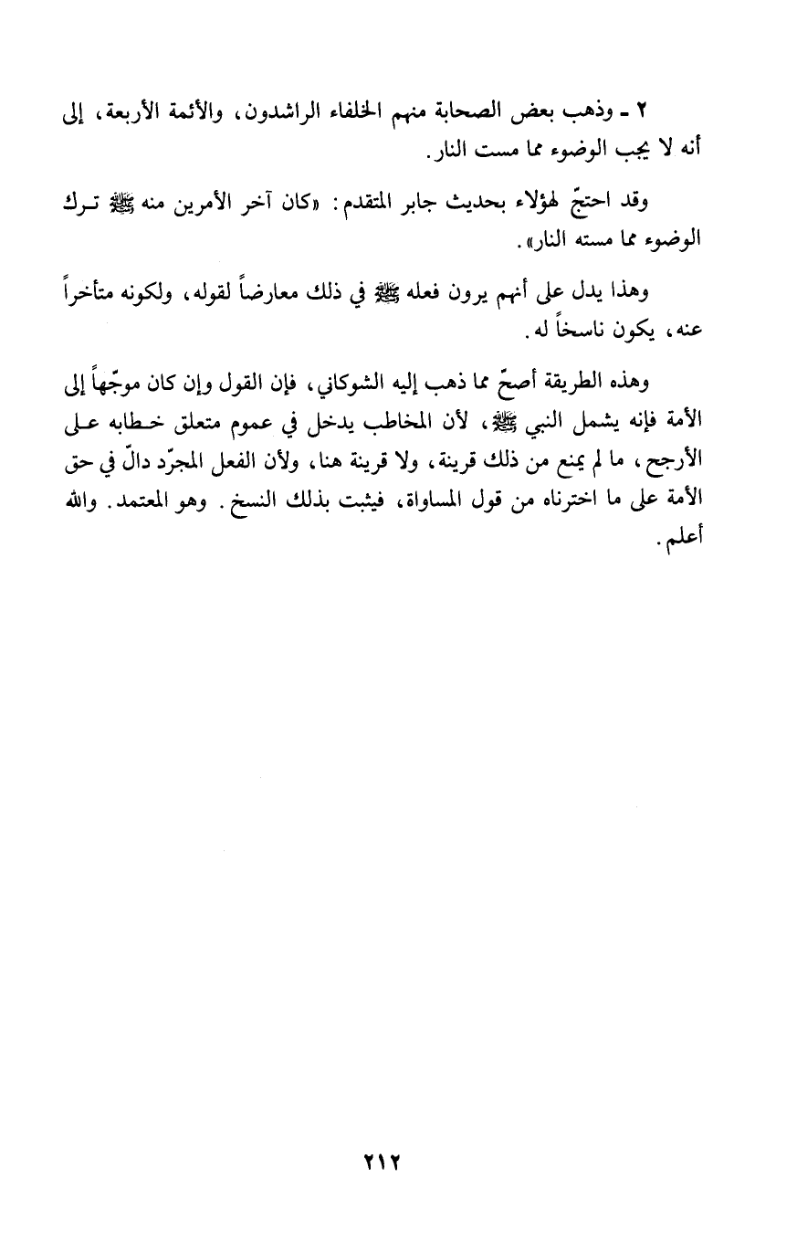 وقد احتجّ لهؤلاء بحديث جابر المتقدم: "كان آخر الأمرين منه - صلى الله عليه وسلم - ترك الوضوء مما مسته النار".