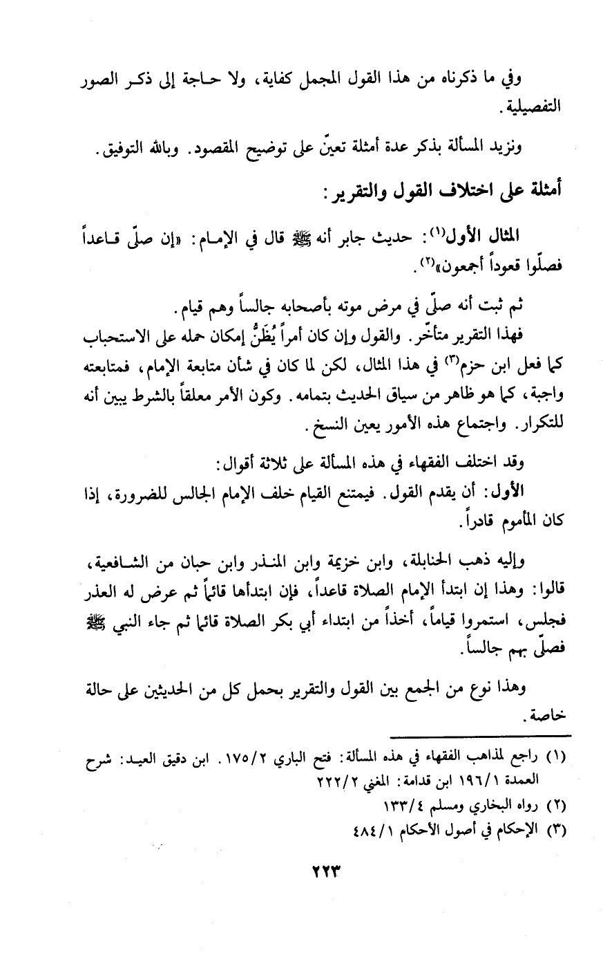 المثال الأول (١): حديث جابر أنه - صلى الله عليه وسلم - قال في الإمام: "إن صلّى قاعداً فصلّوا قعوداً أجمعون" (٢)