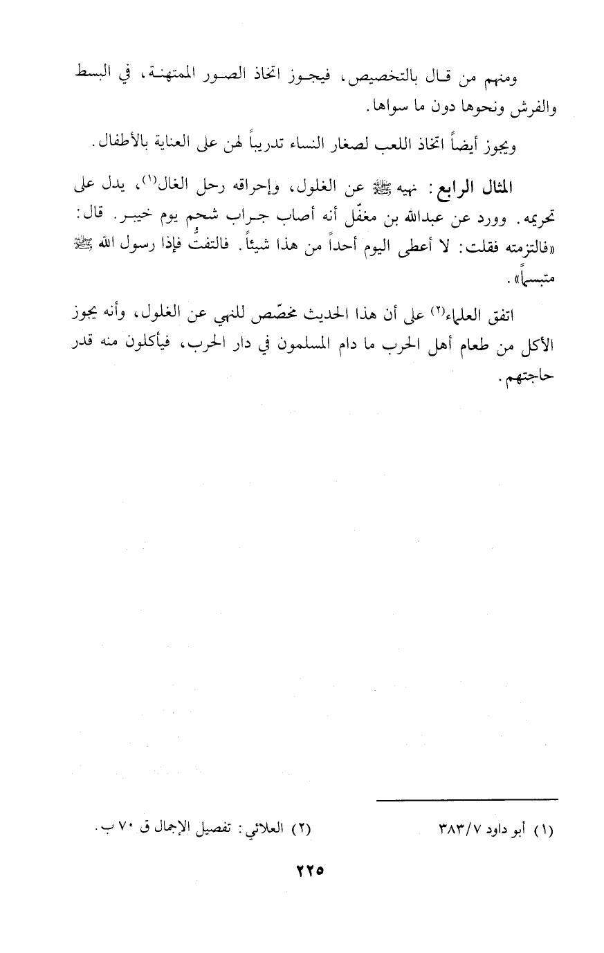 المثال الرابع: نهيه - صلى الله عليه وسلم - عن الغلول، وإحراقه رحل الغال (١)، يدل على تحريمه. وورد عن عبد الله بن مغفّل أنه أصاب جراب شحم يوم خيبر. قال: "فالتزمته فقلت: لا أعطى اليوم أحداً من هذا شيئاً. فالتفتُّ فإذا رسول الله - صلى الله عليه وسلم - متبسماً".