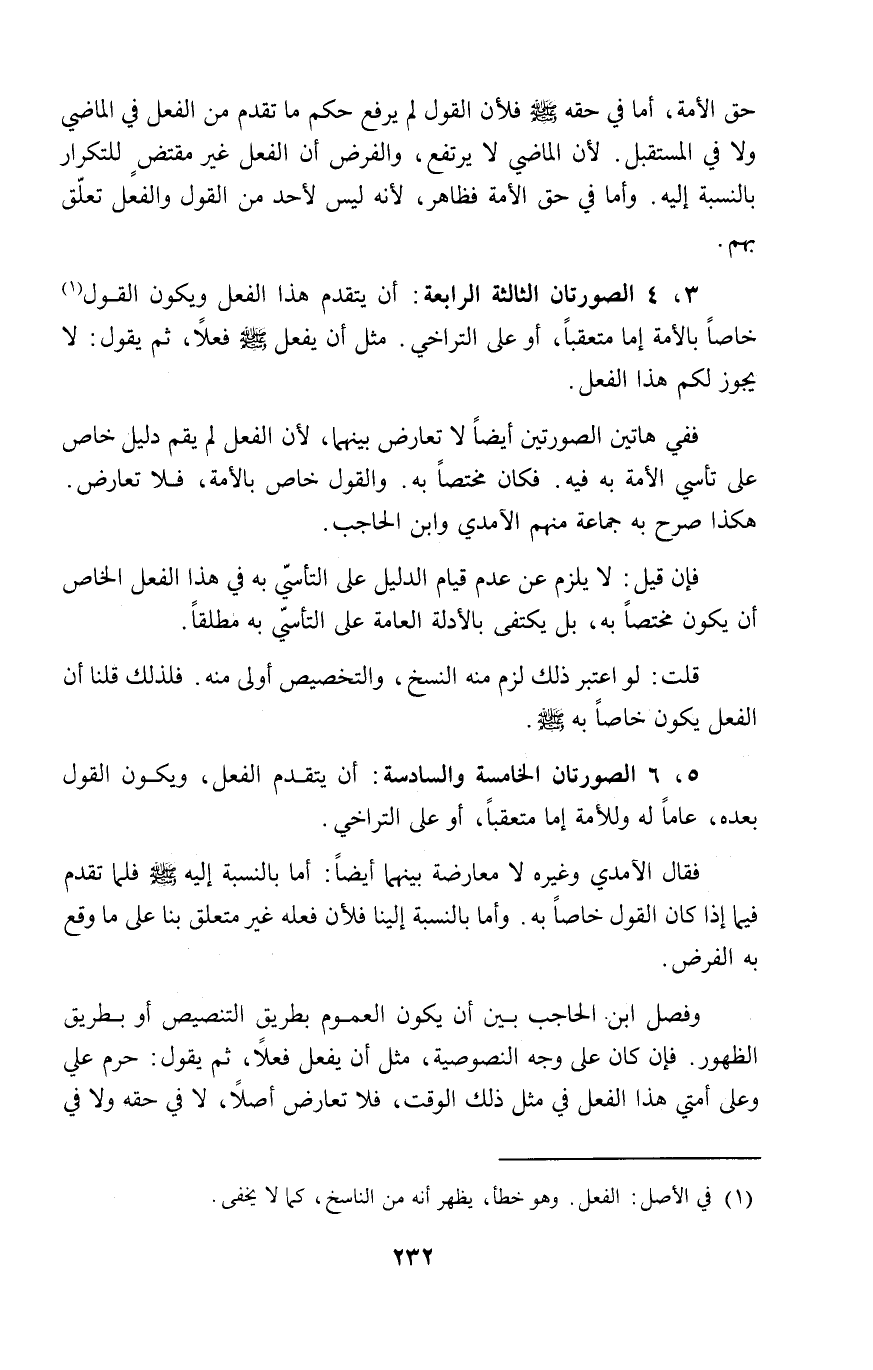 ٣، ٤ الصورتان الثالثة الرابعة: أن يتقدم هذا الفعل ويكون القول (١) خاصاً بالأمة إما متعقباً، أو على التراخي. مثل أن يفعل - صلى الله عليه وسلم - فعلاً، ثم يقول: لا يجوز لكم هذا الفعل.