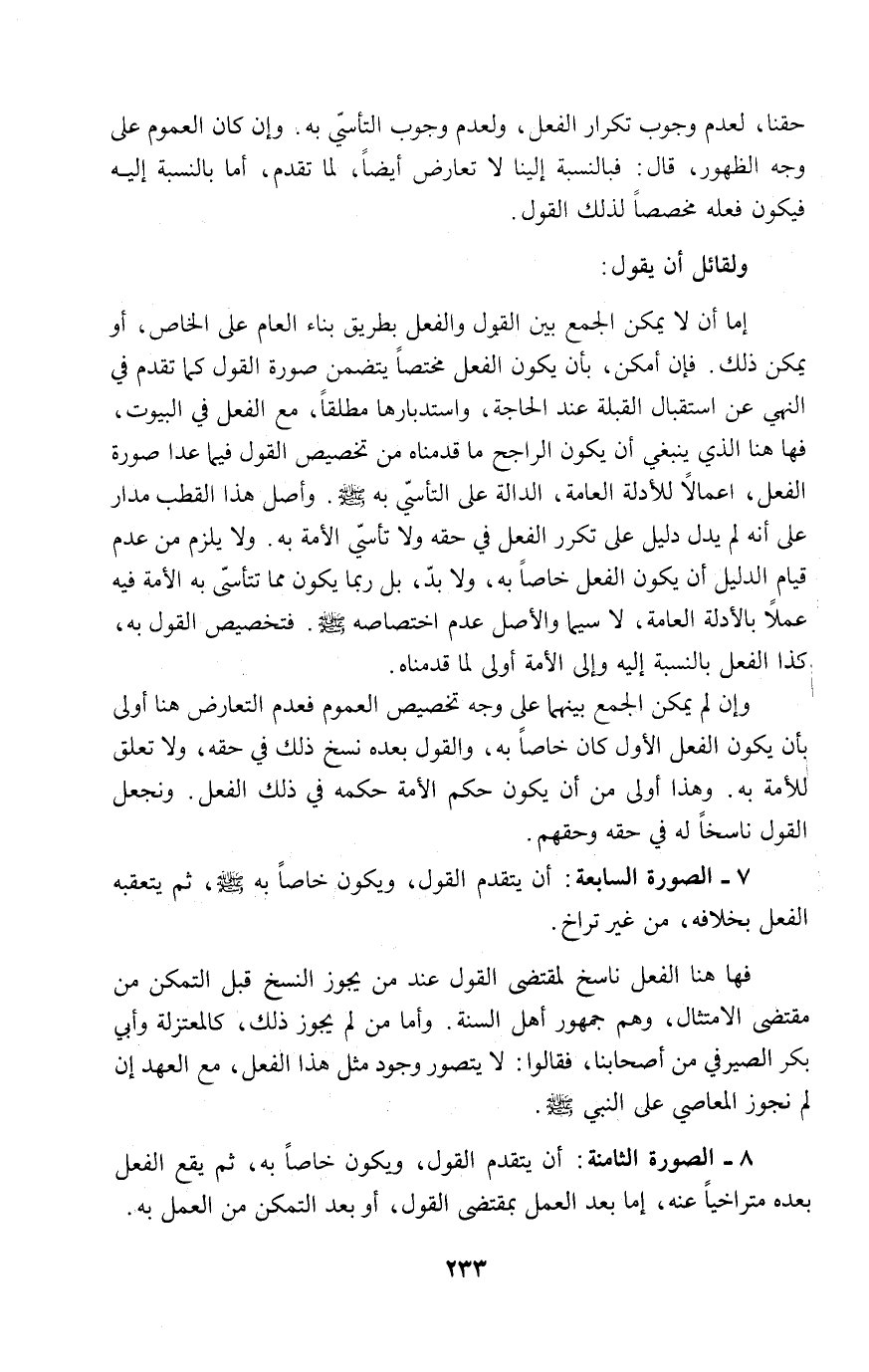 ٧ - الصورة السابعة: أن يتقدم القول، ويكون خاصاً به - صلى الله عليه وسلم -، ثم يتعقبه الفعل بخلافه، من غير تراخ.
