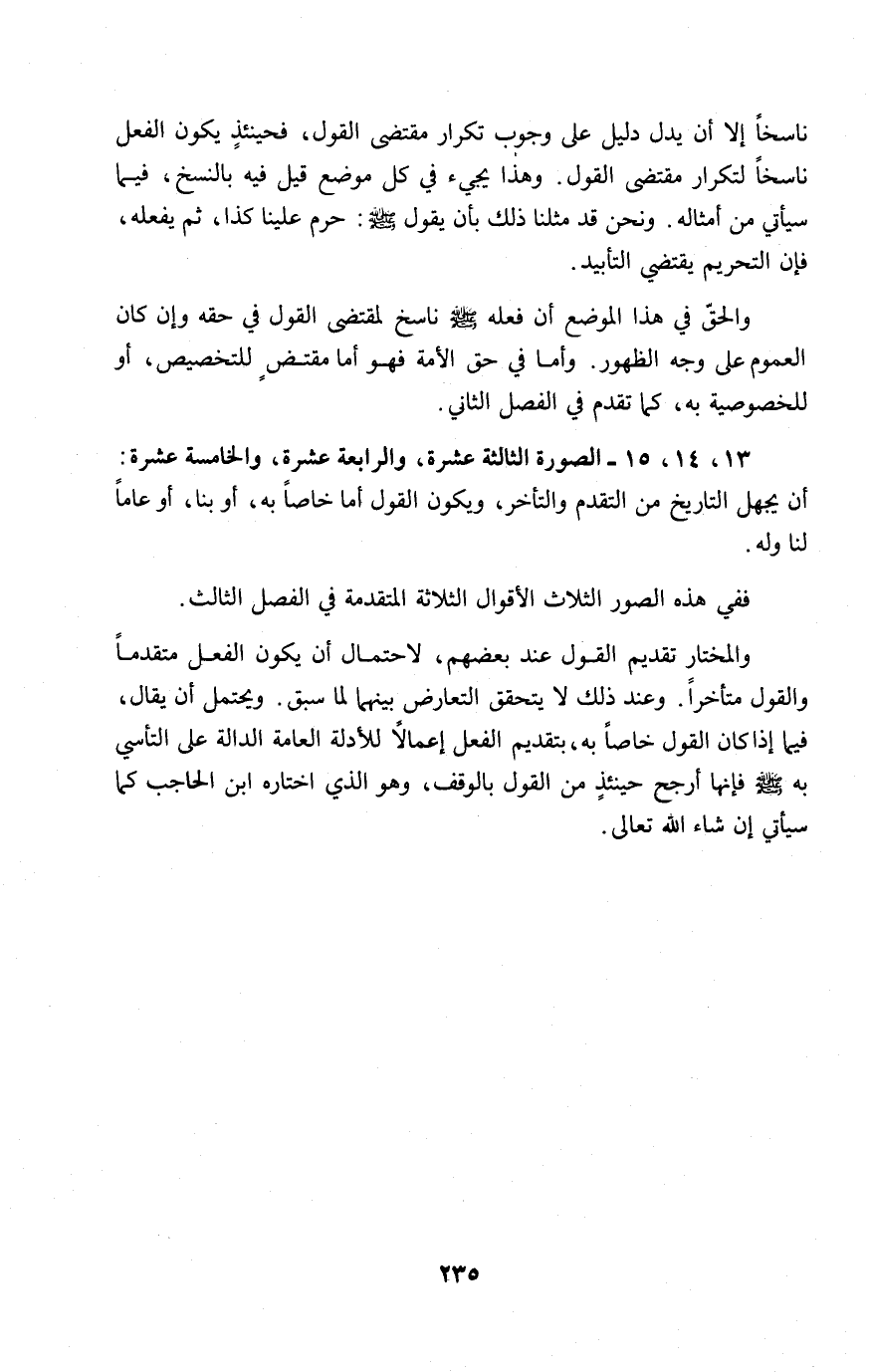 ناسخاً إلا أن يدل دليل على وجوب تكرار مقتضى القول، فحينئذٍ يكون الفعل ناسخاً لتكرار مقتضى القول. وهذا يجيء في كل موضع قيل فيه بالنسخ، فيما سيأتي من أمثاله. ونحن قد مثلنا ذلك بأن يقول - صلى الله عليه وسلم -: حرم علينا كذا، ثم يفعله، فإن التحريم يقتضي التأبيد.