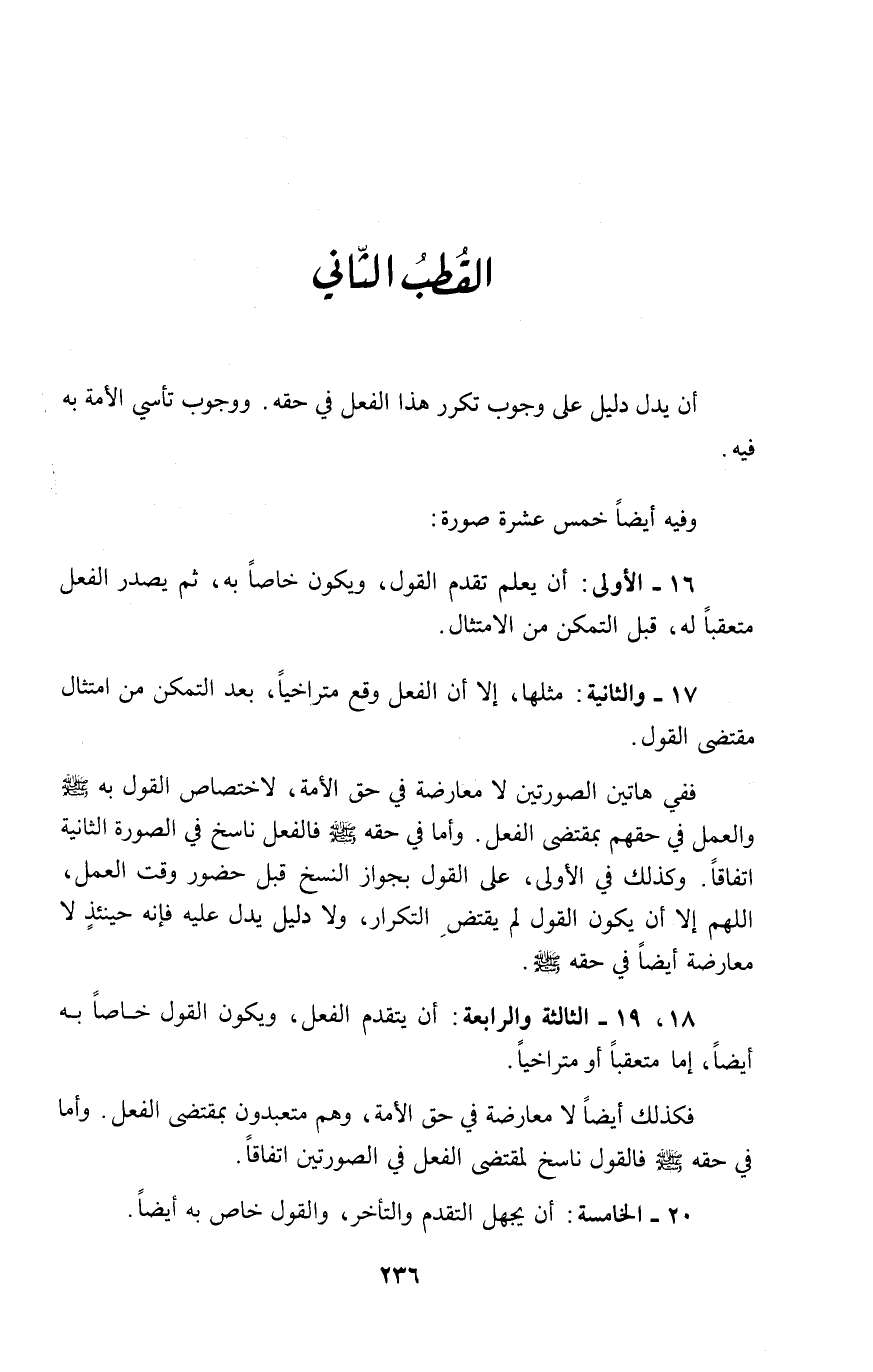 ١٨، ١٩ - الثالثة والرابعة: أن يتقدم الفعل، ويكون القول خاصاً به أيضاً، إما متعقباً أو متراخياً.