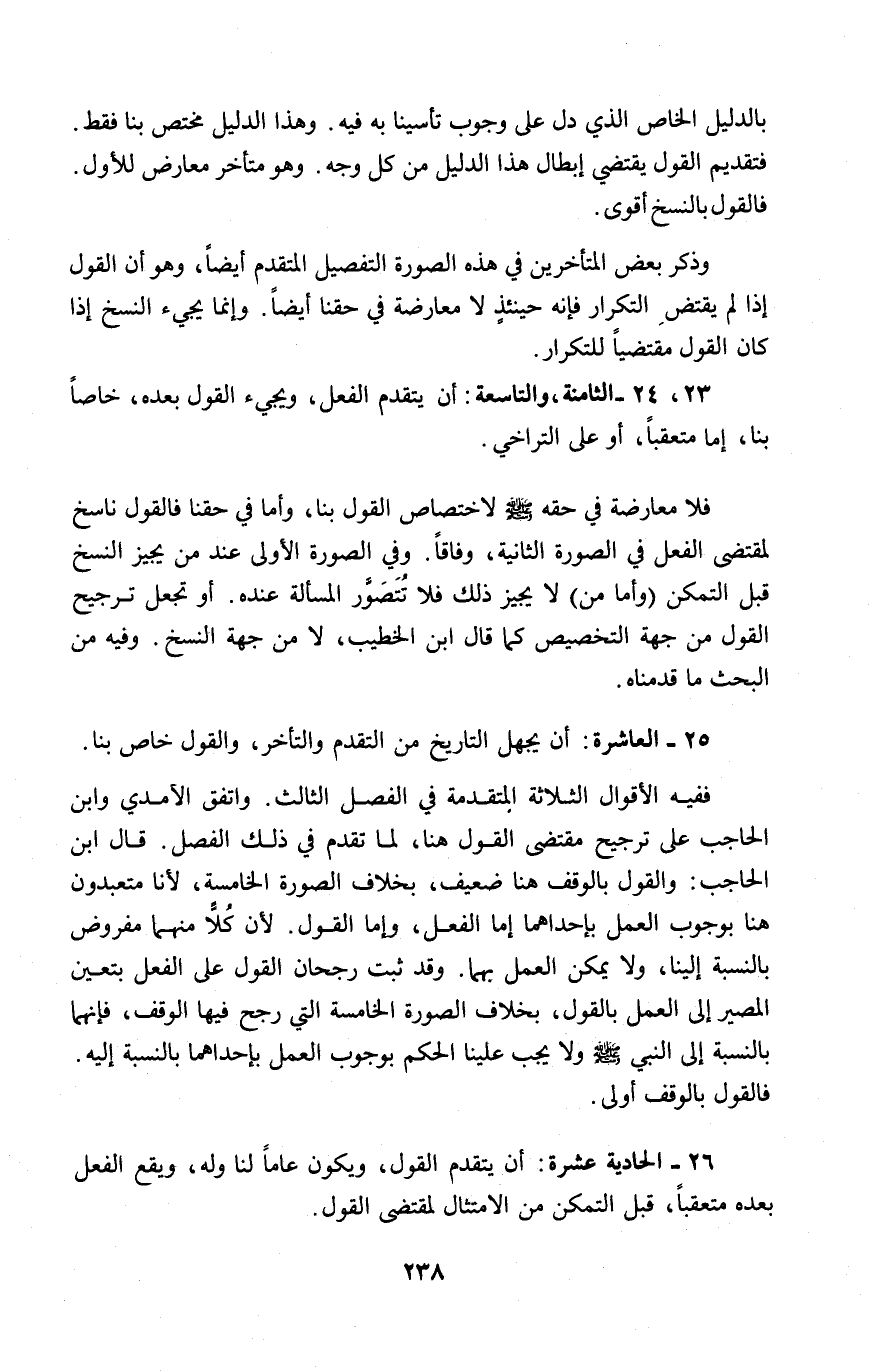 ٢٣، ٢٤ - الثامنة، والتاسعة: أن يتقدم الفعل، ويجيء القول بعده، خاصاً بنا، إما متعقباً، أو على التراخي.