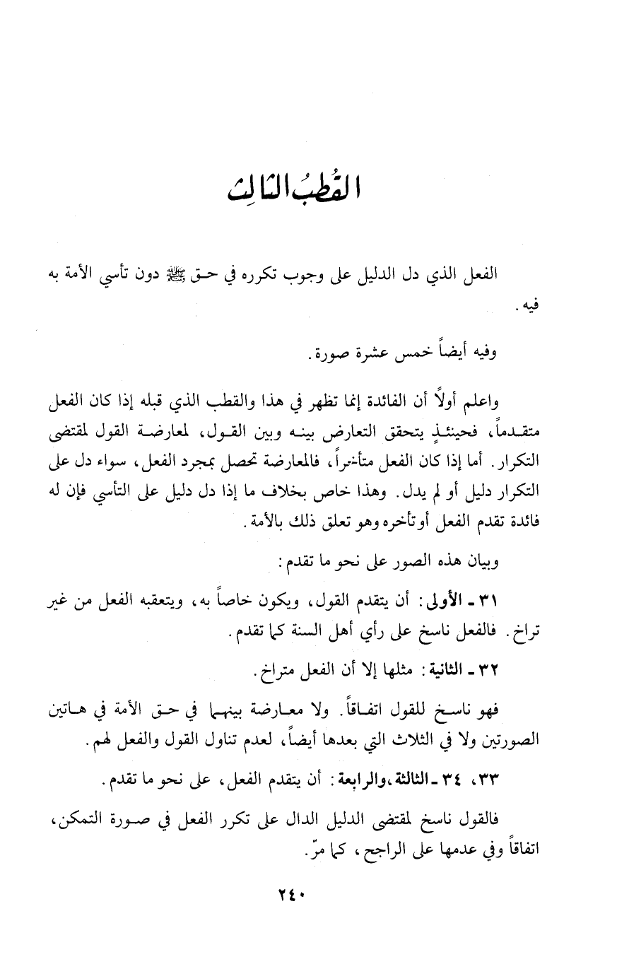 واعلم أولاً أن الفائدة إنما تظهر في هذا والقطب الذي قبله إذا كان الفعل متقدماً، فحينئذٍ يتحقق التعارض بينه وبين القول، لمعارضة القول لمقتضى التكرار. أما إذا كان الفعل متأخراً، فالمعارضة تحصل بمجرد الفعل، سواء دل على التكرار دليل أو لم يدل. وهذا خاص بخلاف ما إذا دل دليل على التأسّي فإن له فائدة تقدم الفعل أو تأخره وهو تعلق ذلك بالأمة.