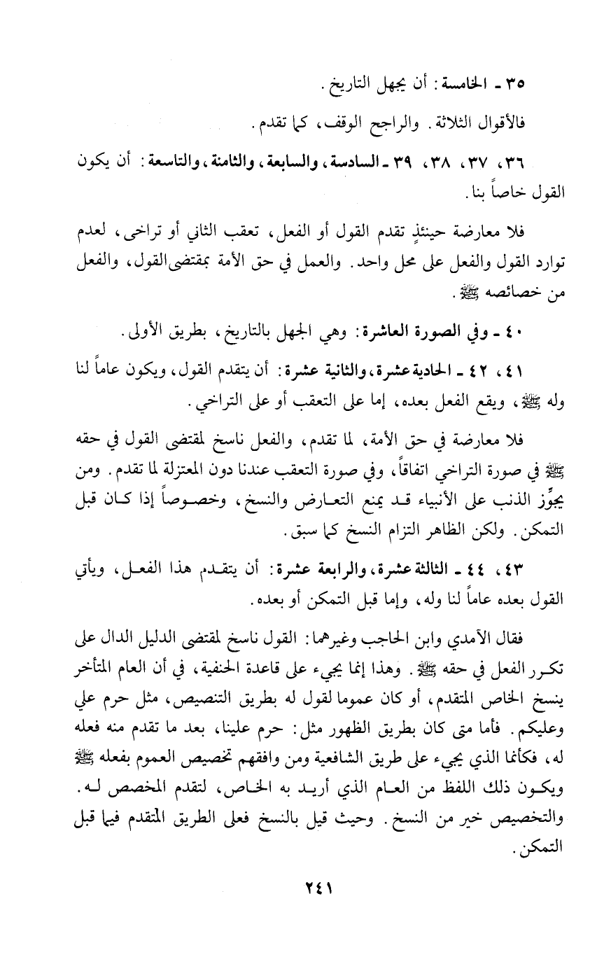 ٤١، ٤٢ - الحادية عشرة، والثانية عشرة: أن يتقدم القول، ويكون عاماً لنا وله - صلى الله عليه وسلم -، ويقع الفعل بعده، إما على التعقب أو على التراخي.