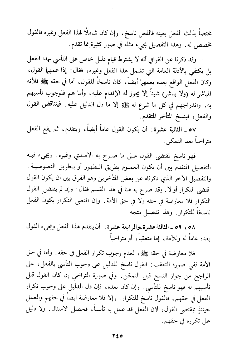 وقد ذكرنا عن القرافي أنه لا يشترط قيام دليل خاص على التأسّي بهذا الفعل بل يكتفي بالأدلة العامة التي تشمل هذا الفعل وغيره، فقال: إذا عمهما القول، وكان الفعل الواقع بعده يعمهما أيضاً، كان ناسخاً للقول، أما في حقه - صلى الله عليه وسلم - فلأنه المباشر له (ولا يباشر) شيئاً إلا يجوز له الإقدام عليه، وأما هم فلوجوب تأسيهم به، واندراجهم في كل ما شرع له - صلى الله عليه وسلم - إلا ما دل الدليل عليه. فيتناقض القول والفعل، فينسخ المتأخر المتقدم.