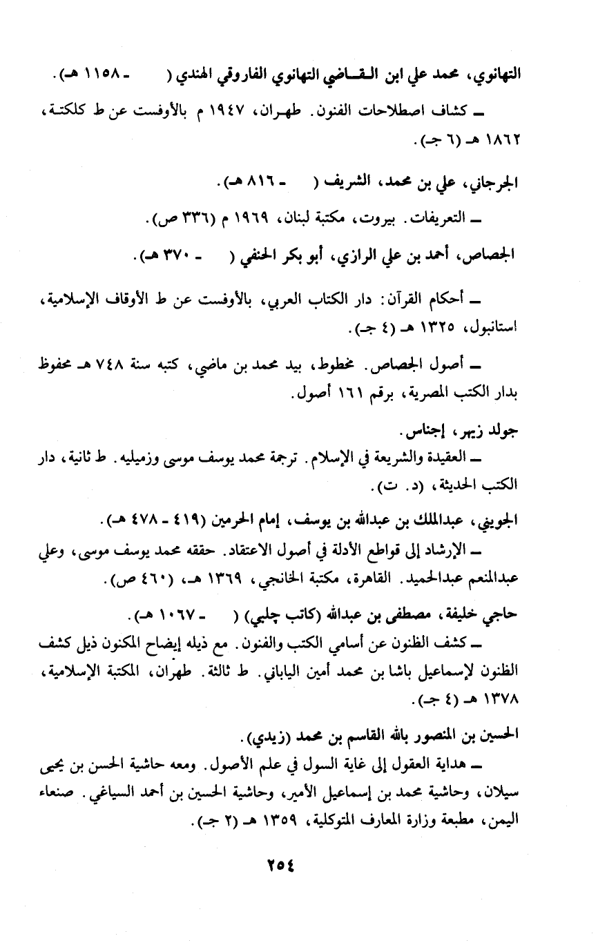 - كشف الظنون عن أسامي الكتب والفنون. مع ذيله إيضاح المكنون ذيل كشف الظنون لإسماعيل باشا بن محمد أمين الياباني. ط ثالثة. طهران، المكتبة الإسلامية، ١٣٧٨ هـ (٤ جـ).