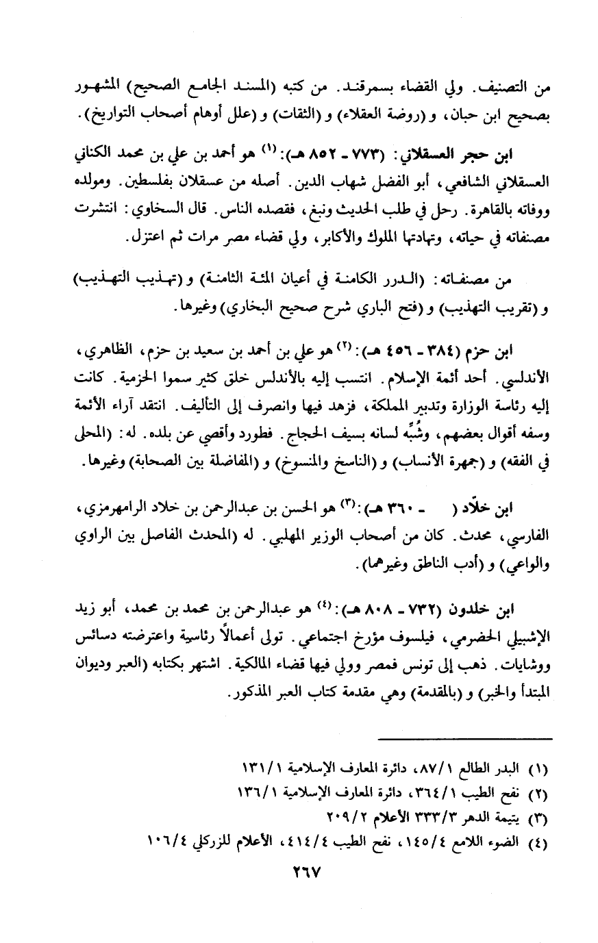ابن خلدون (٧٣٢ - ٨٠٨ هـ): (٤) هو عبد الرحمن بن محمد بن محمد، أبو زيد الإشبيلي الحضرمي، فيلسوف مؤرخ اجتماعي. تولى أعمالاً رئاسية واعترضته دسائس ووشايات. ذهب إلى تونس فمصر وولي فيها قضاء المالكية. اثشهر بكتابه (العبر وديوان المبتدأ والخبر) و (بالمقدمة) وهي مقدمة كتاب العبر المذكور.