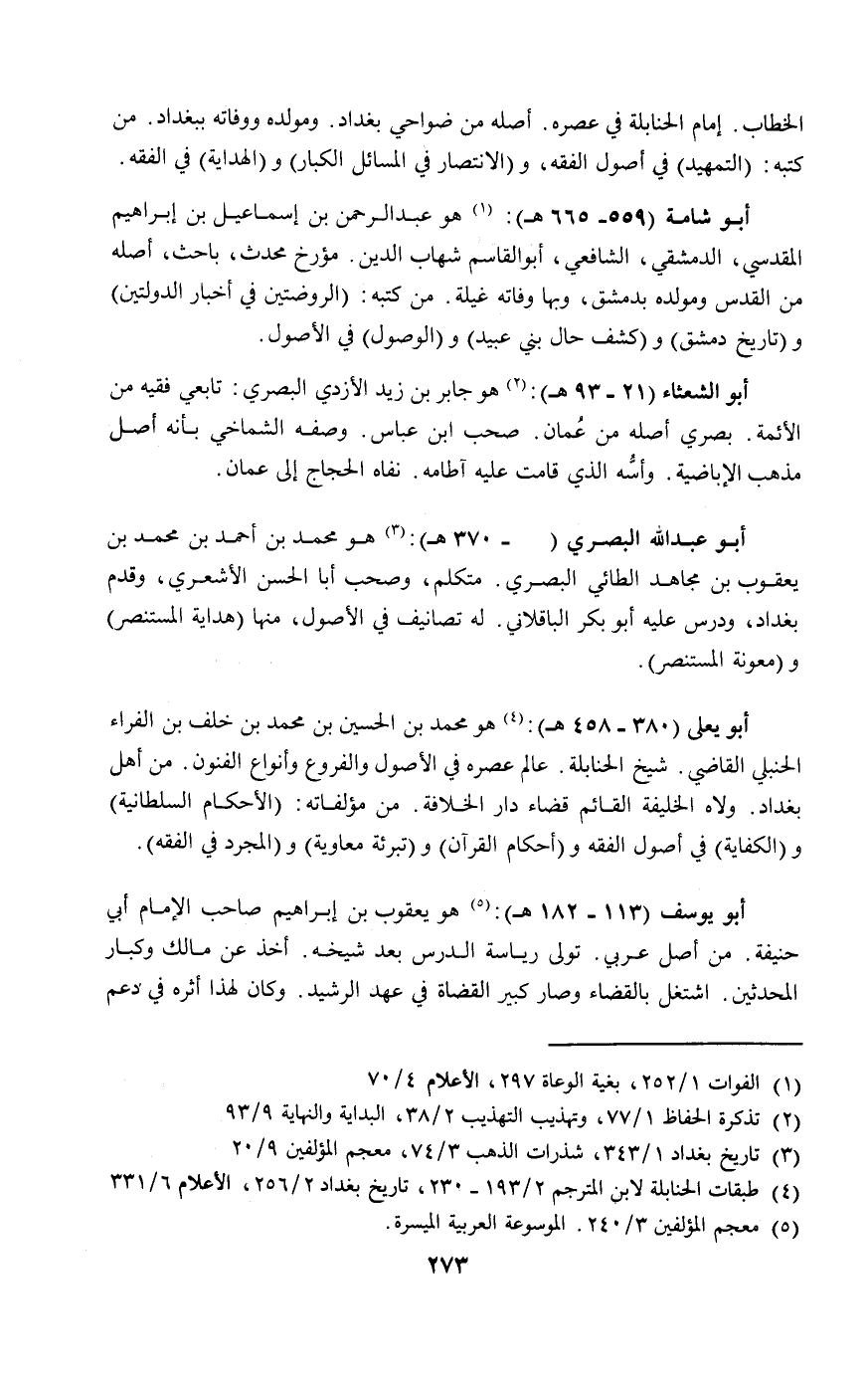 أبو يعلى (٣٨٠ - ٤٥٨هـ): (٤) هو محمد بن الحسين بن محمد بن خلف بن الفراء الحنبلي القاضي. شيخ الحنابلة. عالم عصره في الأصول والفروع وأنواع الفنون. من أهل بغداد. ولاه الخليفة القائم قضاء دار الخلافة. من مؤلفاته: (الأحكام السلطانية) و (الكفاية) في أصول الفقه و (أحكام القرآن) و (تبرئة معاوية) و (المجرد في الفقه).