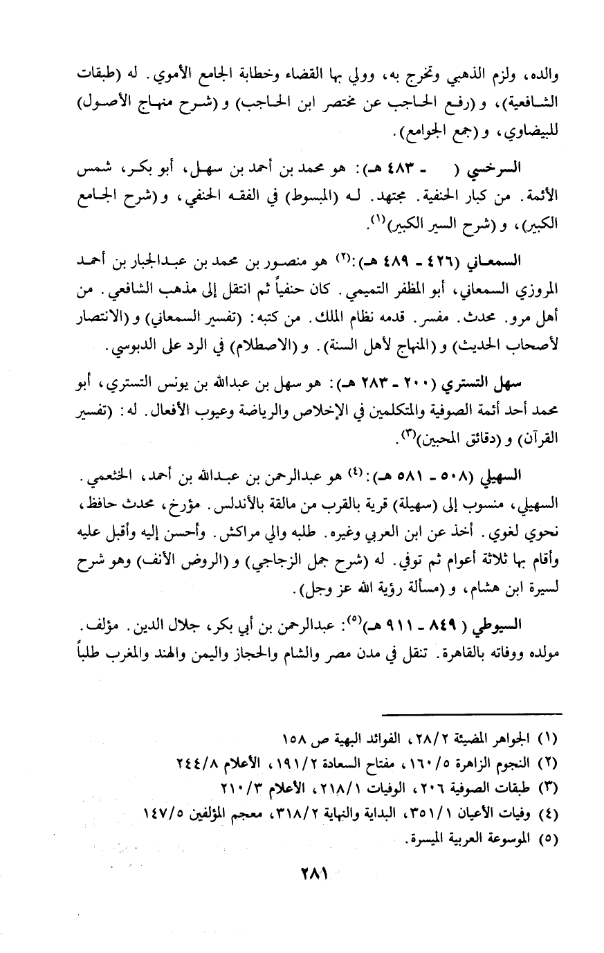 السيوطي (٨٤٩ - ٩١١ هـ) (٥): عبد الرحمن بن أبي بكر، جلال الدين. مؤلف. مولده ووفاته بالقاهرة. تنقل في مدن مصر والشام والحجاز واليمن والهند والمغرب طلباً