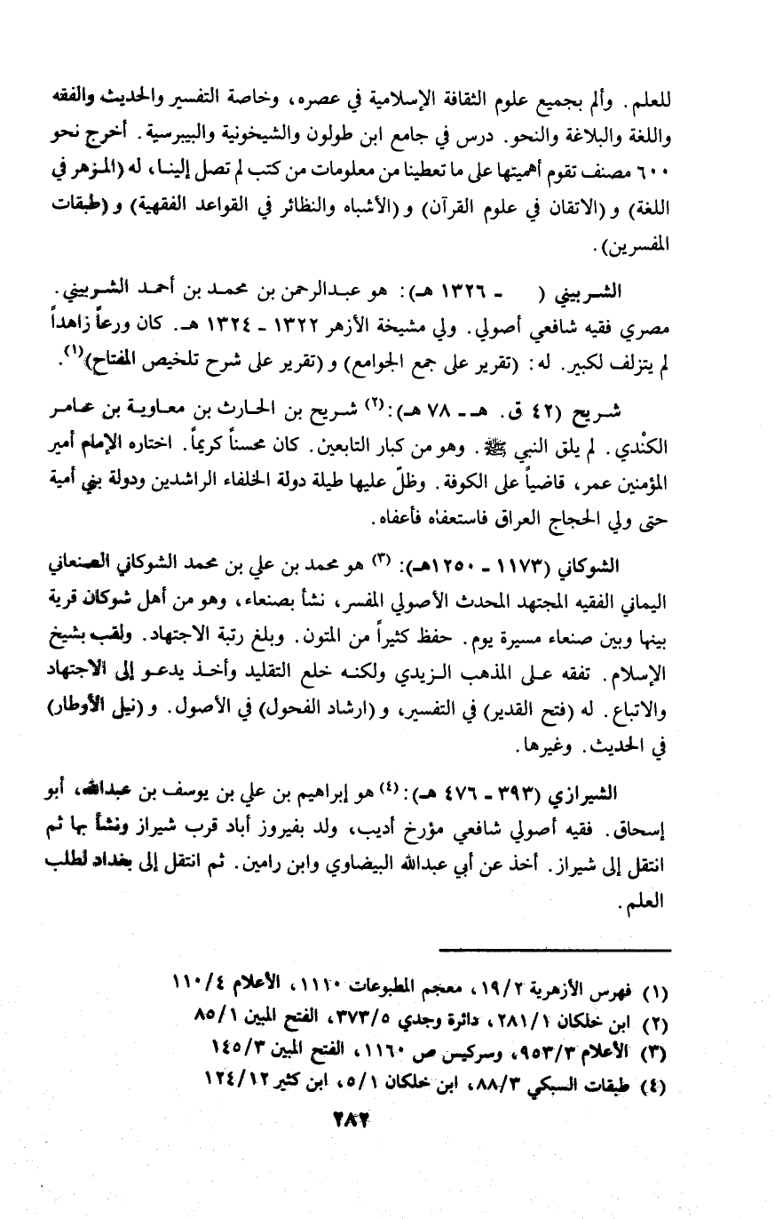 الشيرازي (٣٩٣ - ٤٧٦ هـ): (٤) هو إبراهيم بن علي بن يوسف بن عبد الله، أبو إسحاق. فقيه أصولي شافعي مؤرخ أديب، ولد بفيروز أباد قرب شيراز ونشأ بها ثم انتقل إلى شيراز. أخذ عن أبي عبد الله البيضاوي وابن رامين. ثم انتقل إلى بغداد لطلب العلم.