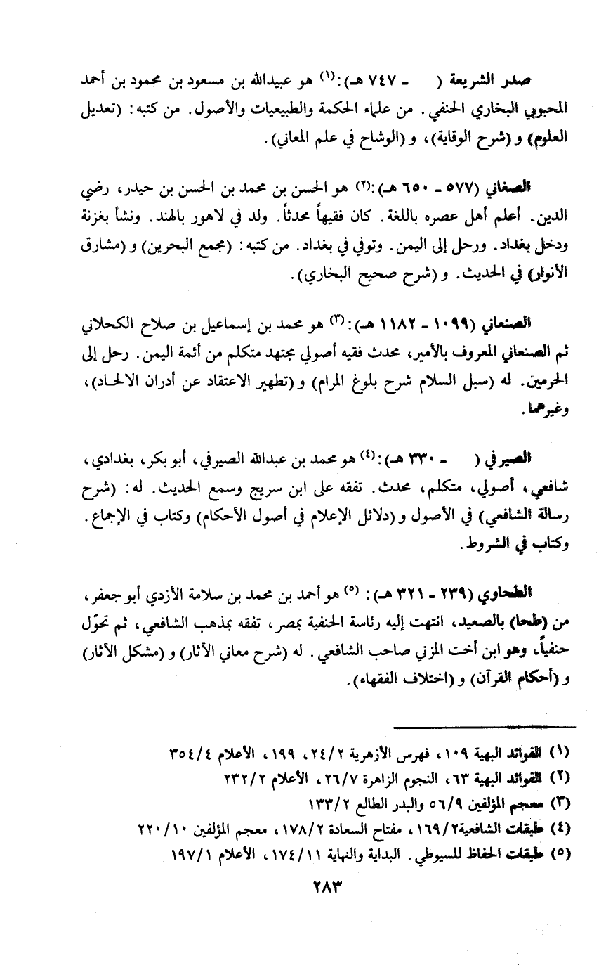 الطحاوي (٢٣٩ - ٣٢١هـ): (٥) هو أحمد بن محمد بن سلامة الأزدي أبو جعفر، من (طحا) بالصعيد، انتهت إليه رئاسة الحنفية بمصر، تفقه بمذهب الشافعي، ثم تحوّل حنفياً، وهو ابن أخت المزني صاحب الشافعي. له (شرح معاني الآثار) و (مشكل الآثار) و (أحكام القرآن) و (اختلاف الفقهاء).