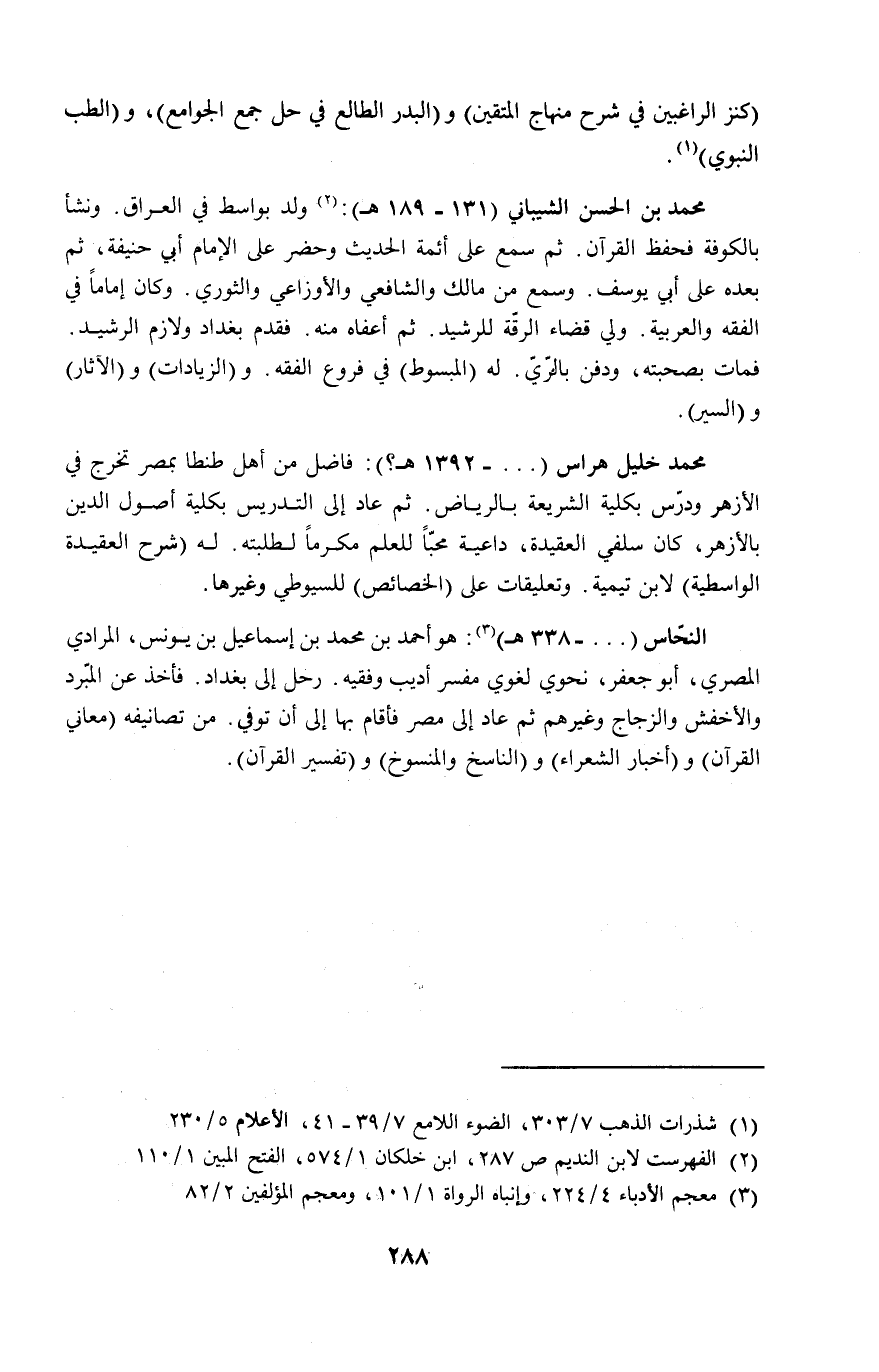 محمد بن الحسن الشيباني (١٣١ - ١٨٩ هـ): (٢) ولد بواسط في العراق. ونشأ بالكوفة فحفظ القرآن. ثم سمع على أئمة الحديث وحضر على الإمام أبي حنيفة، ثم بعده على أبي يوسف. وسمع من مالك والشافعي والأوزاعي والثوري. وكان إماماً في الفقه والعربية. ولي قضاء الرقّة للرشيد. ثم أعفاه منه. فقدم بغداد ولازم الرشيد. فمات بصحبته، ودفن بالرّيّ. له (المبسوط) في فروع الفقه. و (الزيادات) و (الآثار) و (السير).