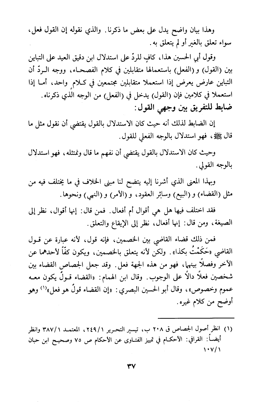 فمن ذلك قضاء القاضي بين الخصمين، فإنه قول، لأنه عبارة عن قول القاضي "حَكَمْتُ بكذا". ولكن لأنه يتعلق بالخصمين، ويكون كفّاً لأحدهما عن الآخر وفصلاً بينهما، فهو من هذه الجهة فعل. وقد جعل الجصاص القضاء بين شخصين فعلاً دالاً على الوجوب. وقال ابن الهمام: "القضاء قولٌ يكون معه عموم وخصوص"، وقال أبو الحسين البصري: "إن القضاء قولٌ هو فعل" (١) وهو أوضح من كلام غيره.