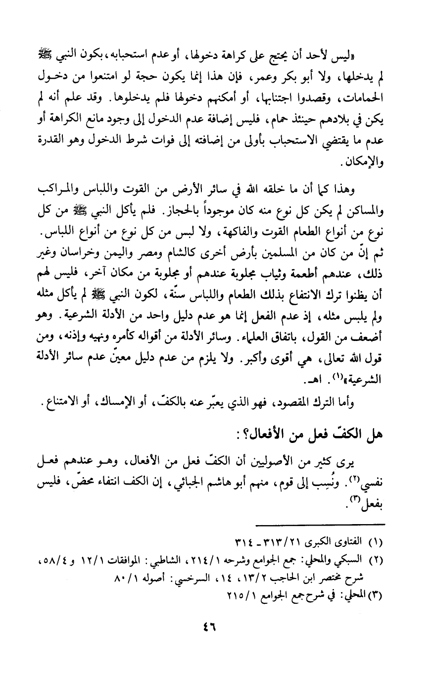 يرى كثير من الأصوليين أن الكفّ فعل من الأفعال، وهو عندهم فعل نفسي (٢). ونُسِب إلى قوم، منهم أبو هاشم الجبائي، إن الكف انتفاء محضّ، فليس بفعل (٣).